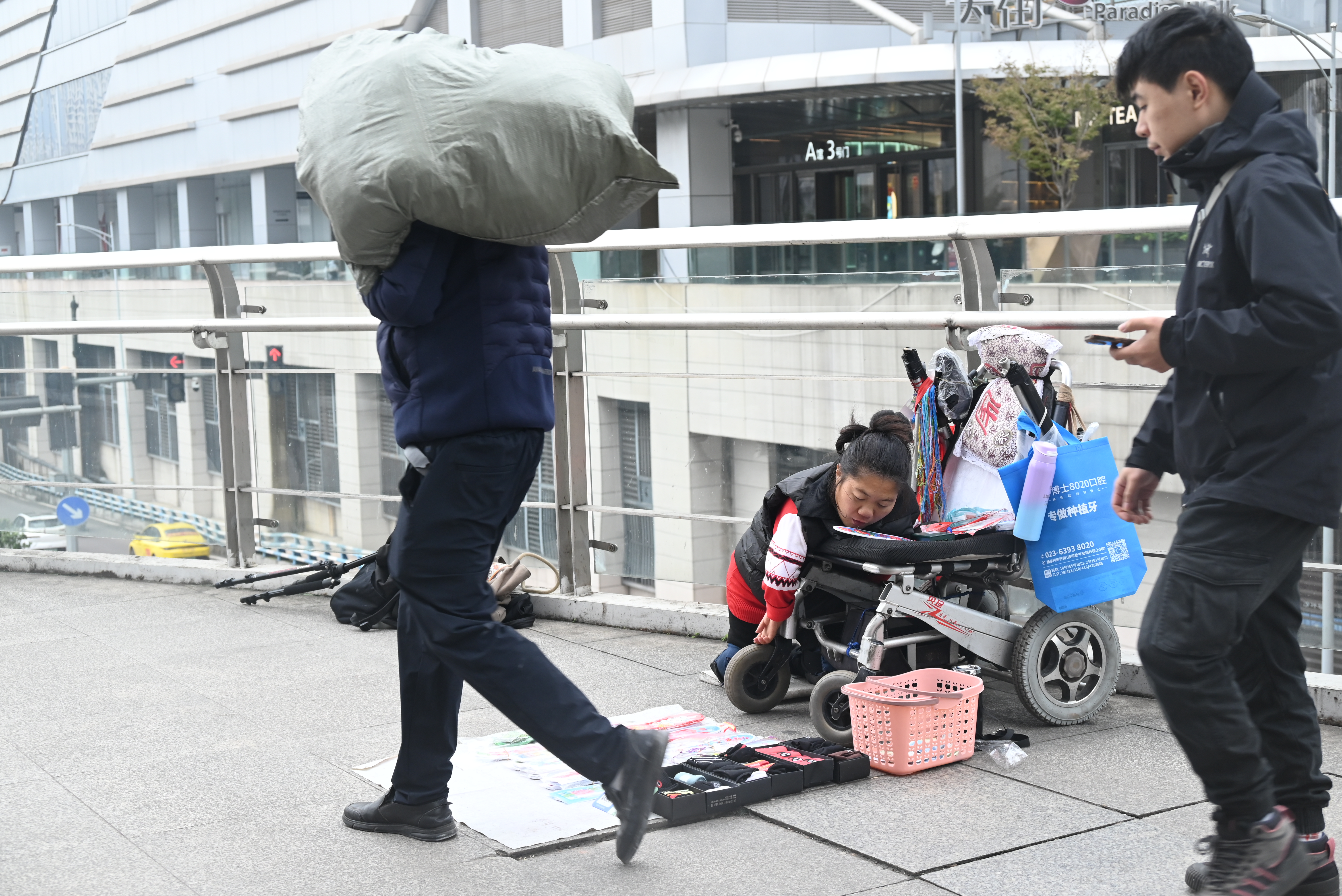 代汝群的摊位不固定——袁家岗、凤天路、新桥,她随着人流漂泊。天桥上,她跪坐终日,身旁放着一瓶水和几块干粮。因无法独自吃饭,她常一天只吃一顿,“实在饿得不行才点外卖,十几块太贵了”。