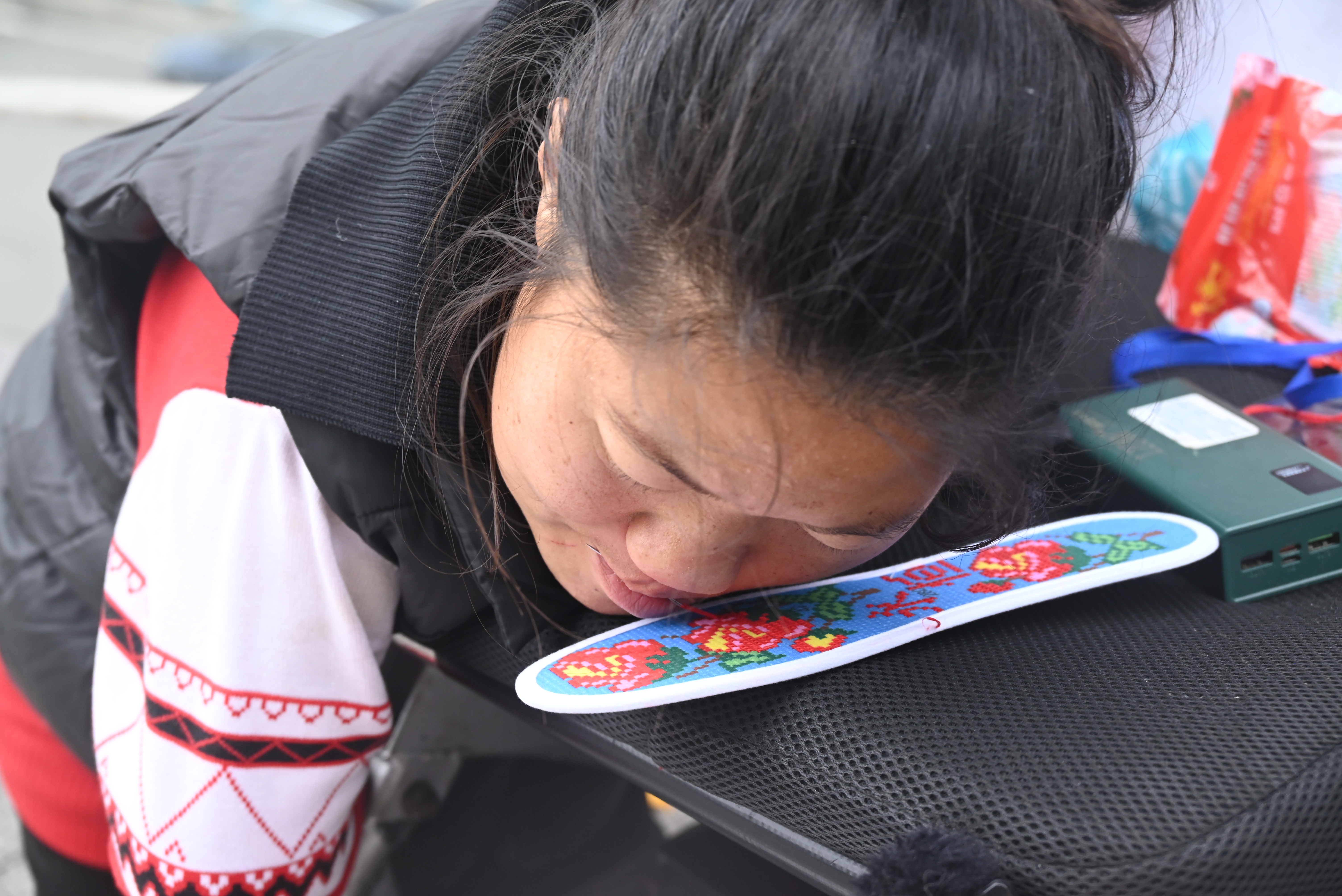 36岁的代汝群是重庆江津人,先天性肢体一级残疾。她的双手无法抬起,双腿无法站立,只能依靠轮椅行动。在熙熙攘攘的街头,她跪坐着,用嘴巴衔针绣鞋垫,这一特殊的刺绣方式让她成为一道让人既心疼又心生敬意的风景。