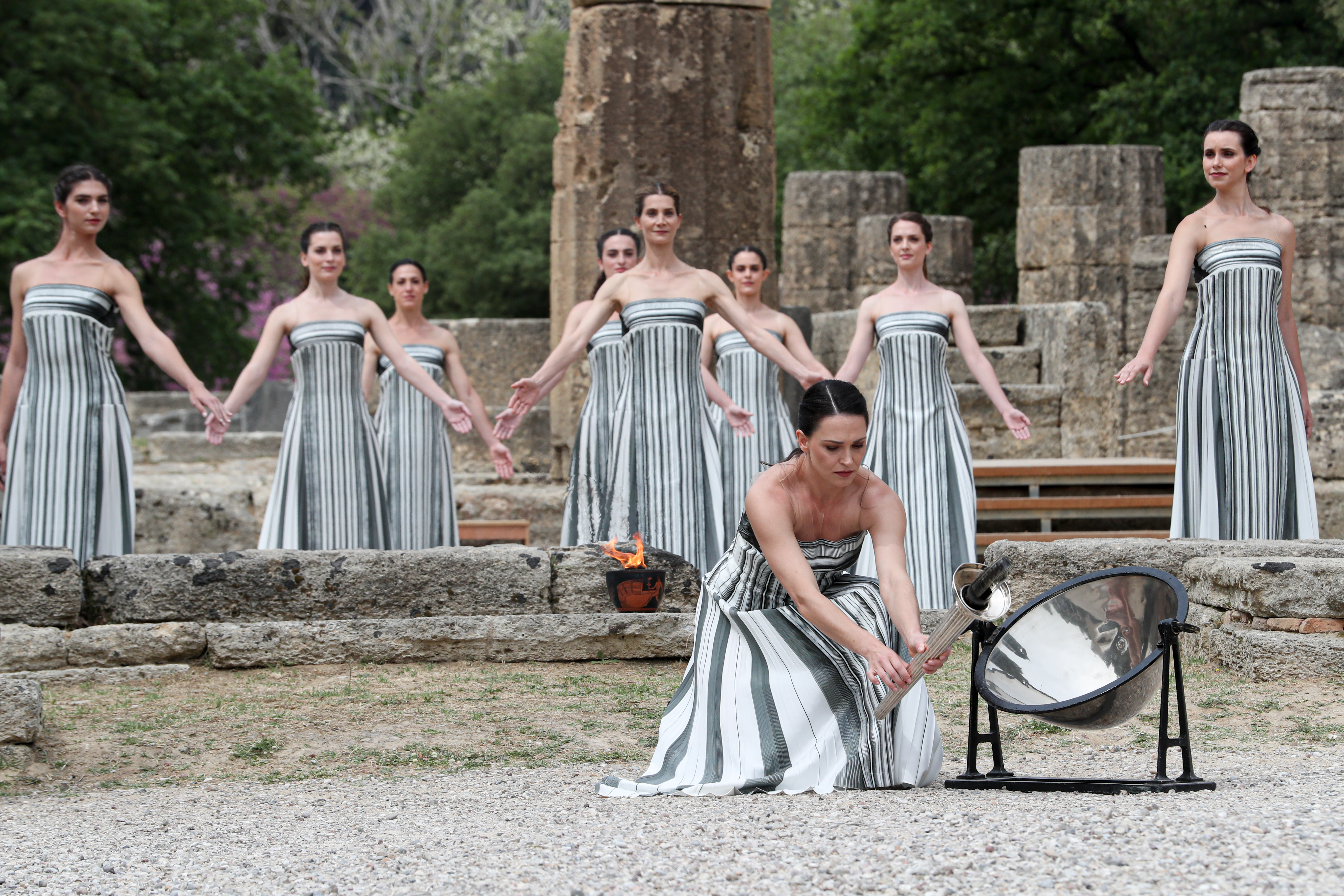 在有2500多年历史的赫拉神庙前,希腊女演员玛丽·米娜扮演的古希腊女祭司在当地时间中午12时16分点燃了火种。她在火种采集仪式上按照传统祈福世界和平,希望法国巴黎成功举办奥运会。