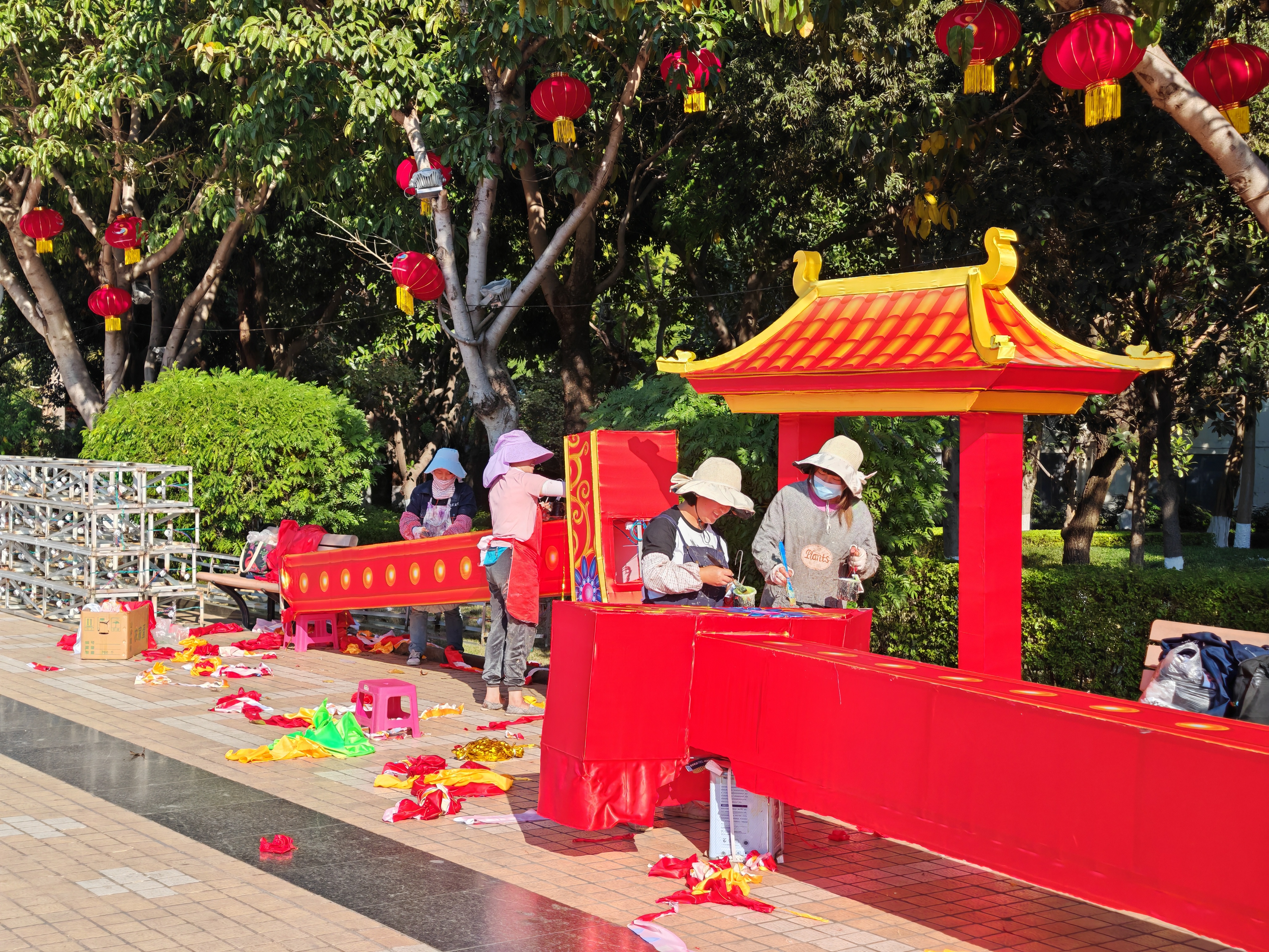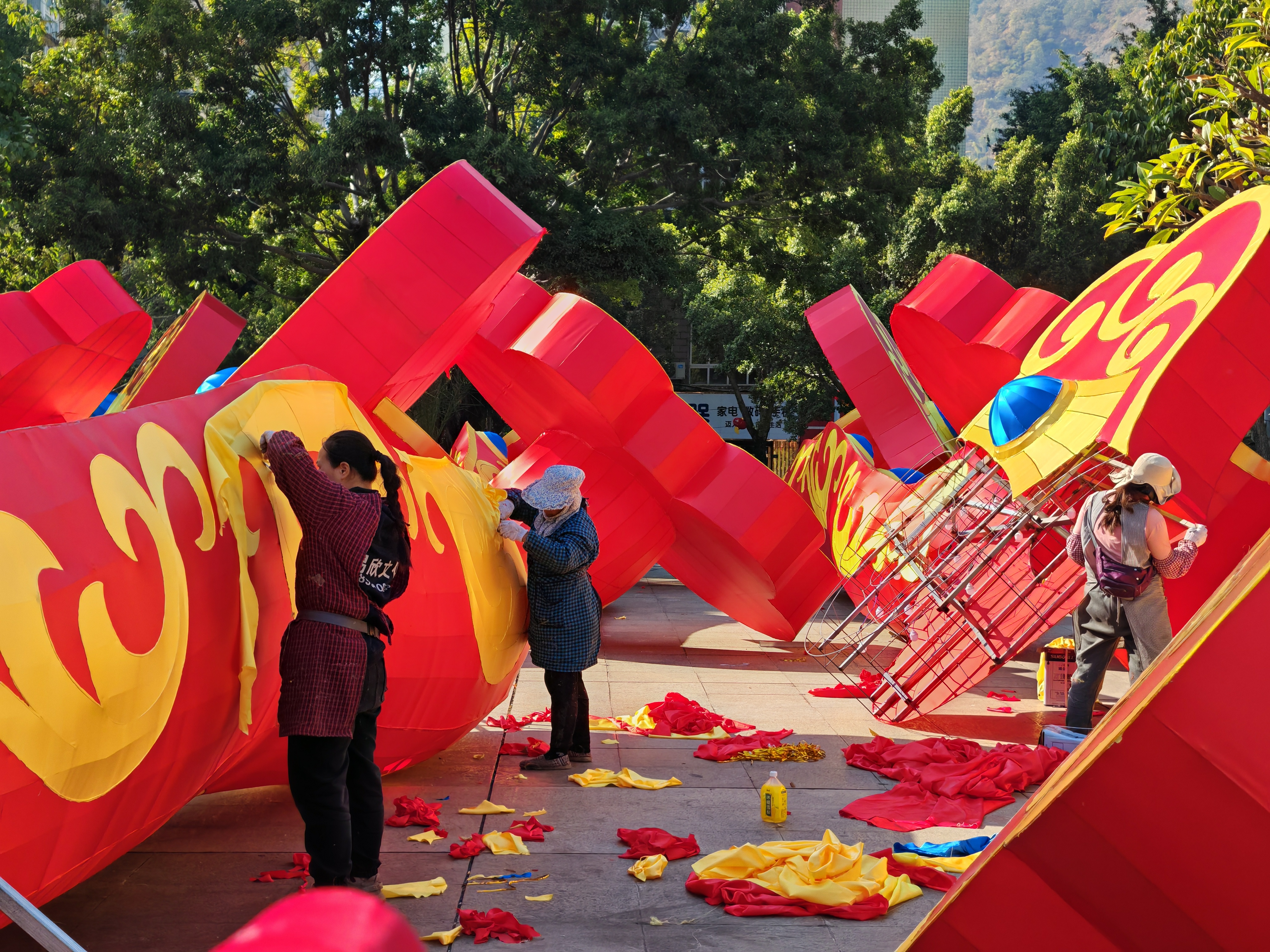 12月26日,在四川攀枝花市米易县文化广场、易园、安宁河水面及河滨长廊等地,焊接、裱糊、布灯,工匠们正在紧锣密鼓制作彩灯。2024年第十五届米易灯会预计从元旦节开始,将陆续亮灯。