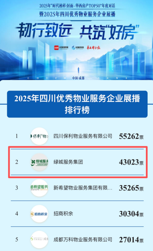 今年,绿城服务凭借其深耕品质与创新服务,在“2025四川优秀物业服务企业评选”网络票选中脱颖而出,以高票荣获第二名,不仅彰显了其卓越的品牌影响力与用户口碑,更凸显了市场对其长期坚守服务初心的广泛认可。