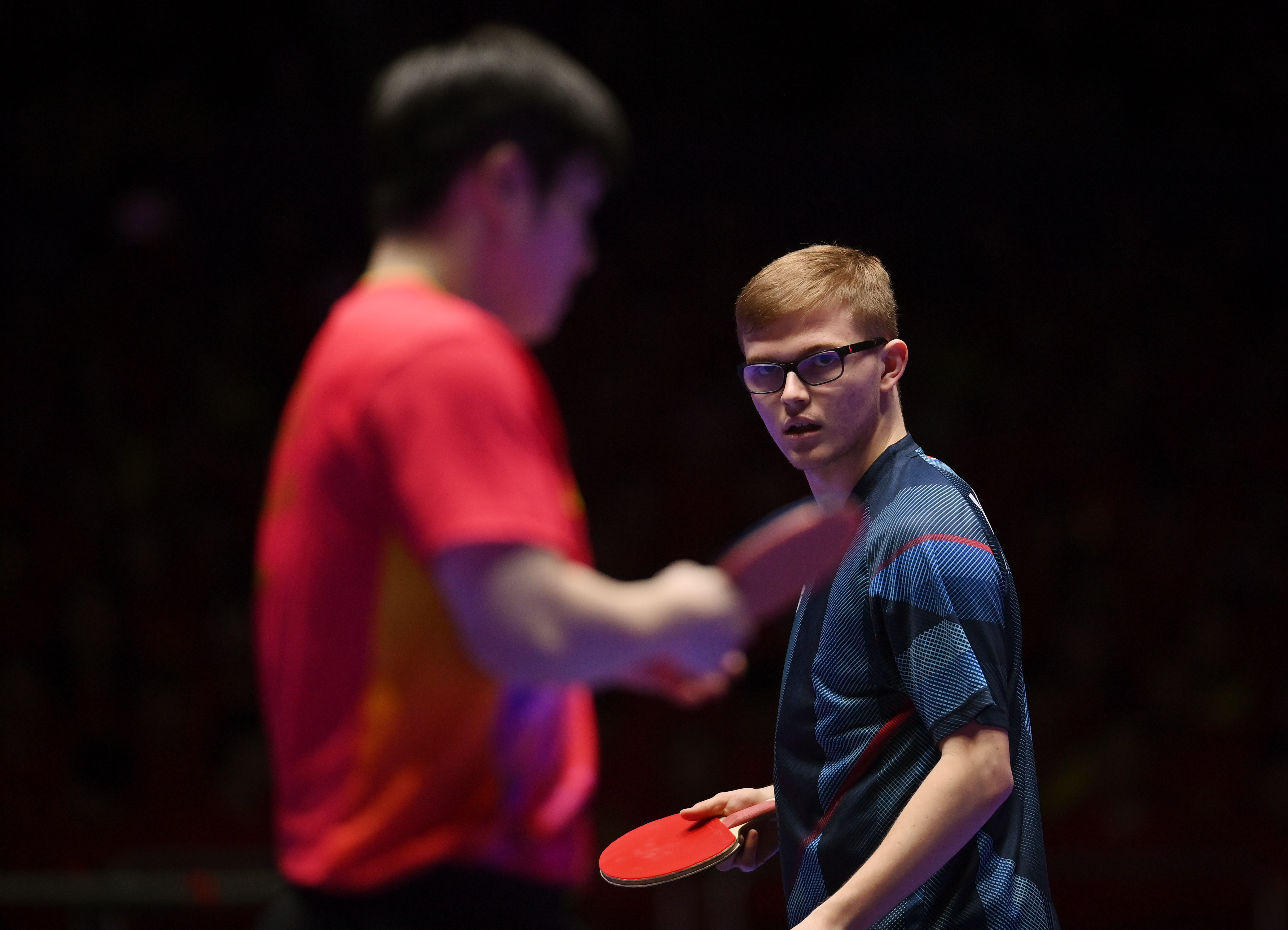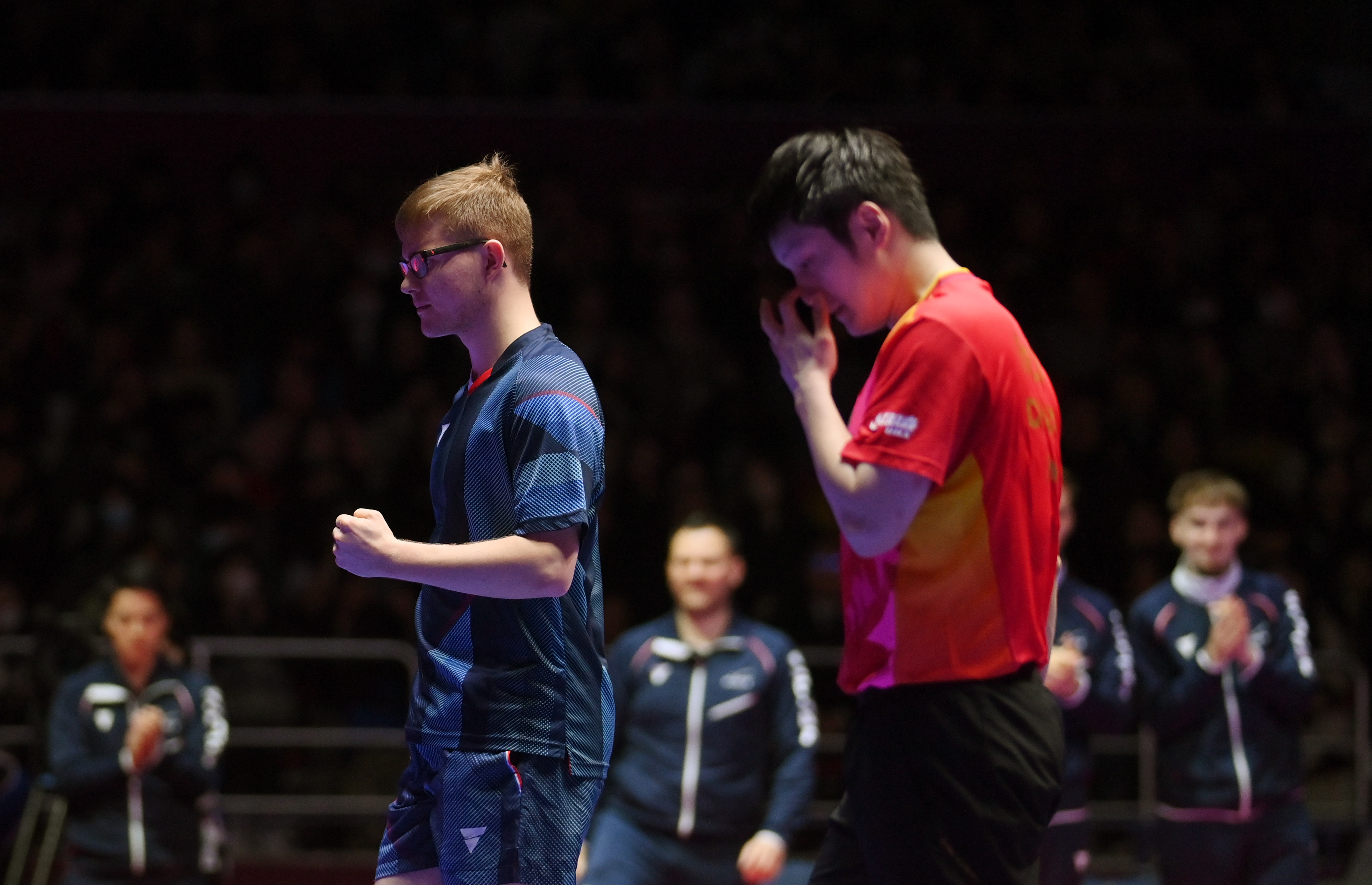 2月25日,法国队选手艾利克斯·勒布伦(右)与中国队选手樊振东在比赛中。新华社记者 陶希夷 摄