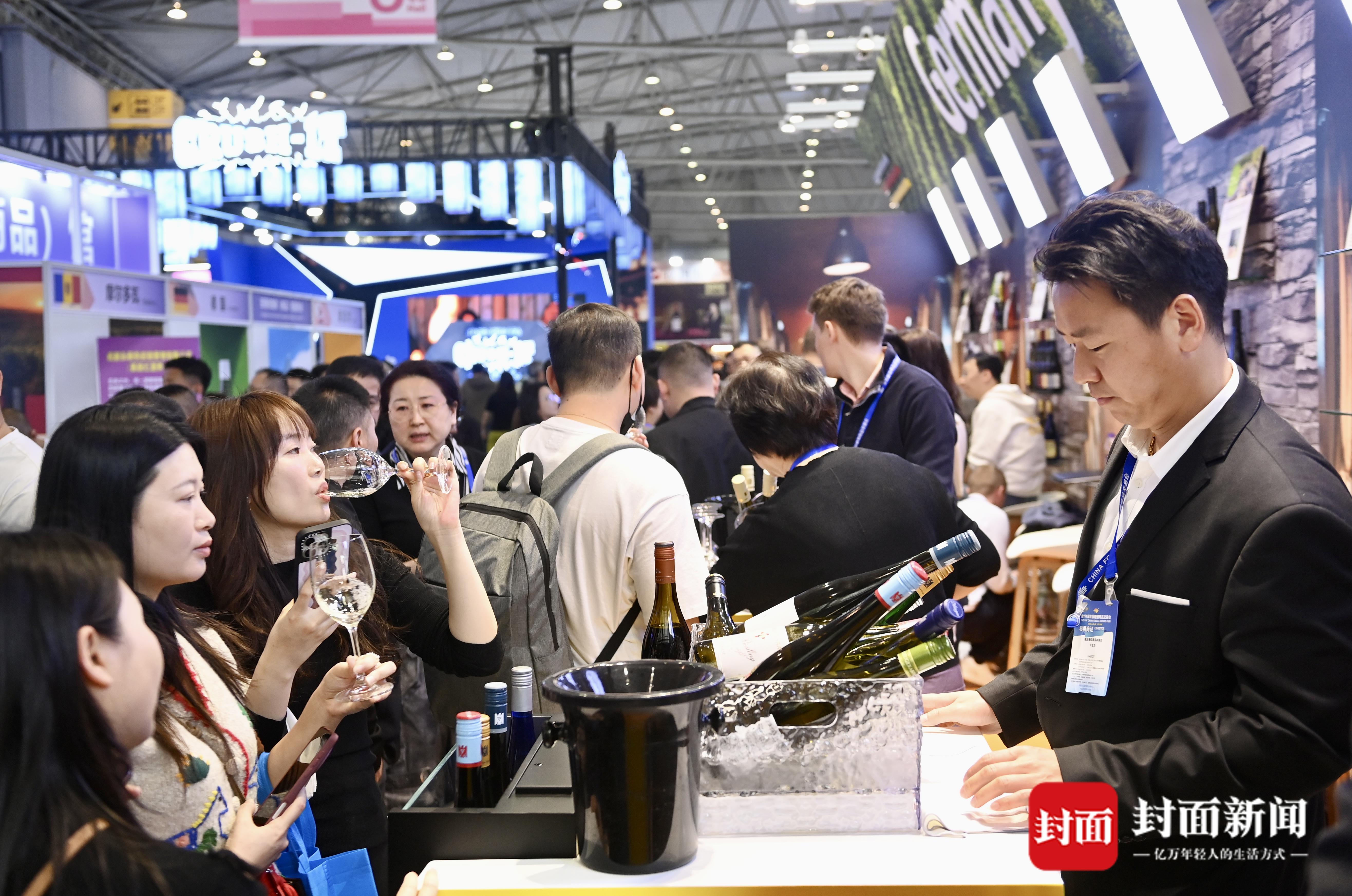 3月26日,第114届全国糖酒商品交易会在成都开幕,世纪城新国际会展中心展区市民品尝红酒。