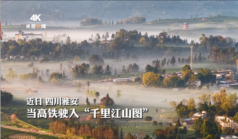 画面中,现代动车穿梭在春日茶田,远处有雪山亭台楼阁,晨曦里的平流雾掩映着川西民居,若隐若现。一步一景,一帧一画,活脱脱一卷从古画中走出的《千里江山图》,传统与现代融合得恰到好处。