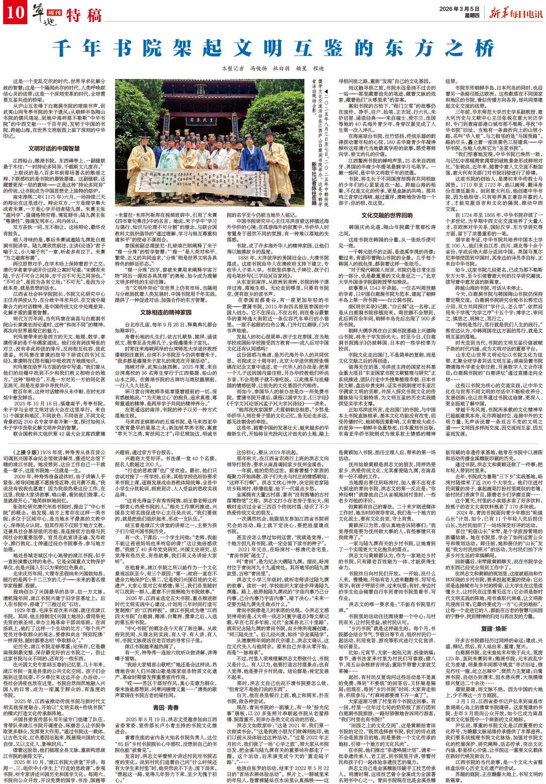 从庐山五老峰下白鹿洞书院的琅琅书声,到武夷山间考亭书院的朱子遗风;从朝鲜半岛陶山书院的儒风绵延,到地中海畔那不勒斯“中华书院”的中西交融……千百年间,发轫于中国的书院,跨越山海,在世界文明版图上留下深刻的中华印记。