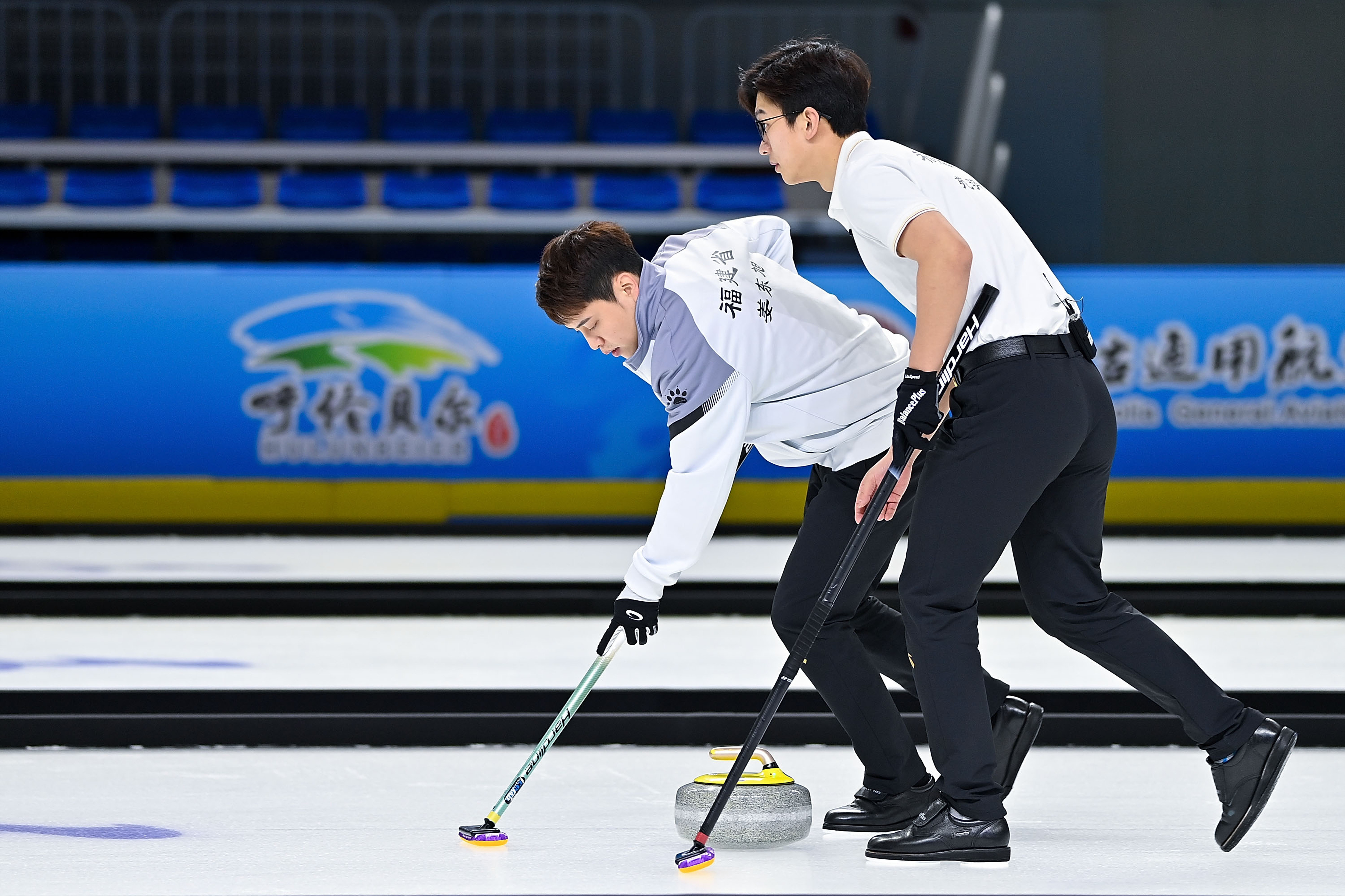 2月26日,福建队选手姜东旭和苑明杰(右)在比赛中擦冰。新华社记者 杨晨光 摄