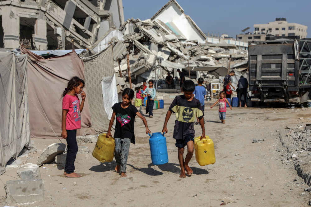 7月17日,巴勒斯坦儿童在加沙城取水。新华社发(里泽克·阿卜杜勒贾瓦德摄)