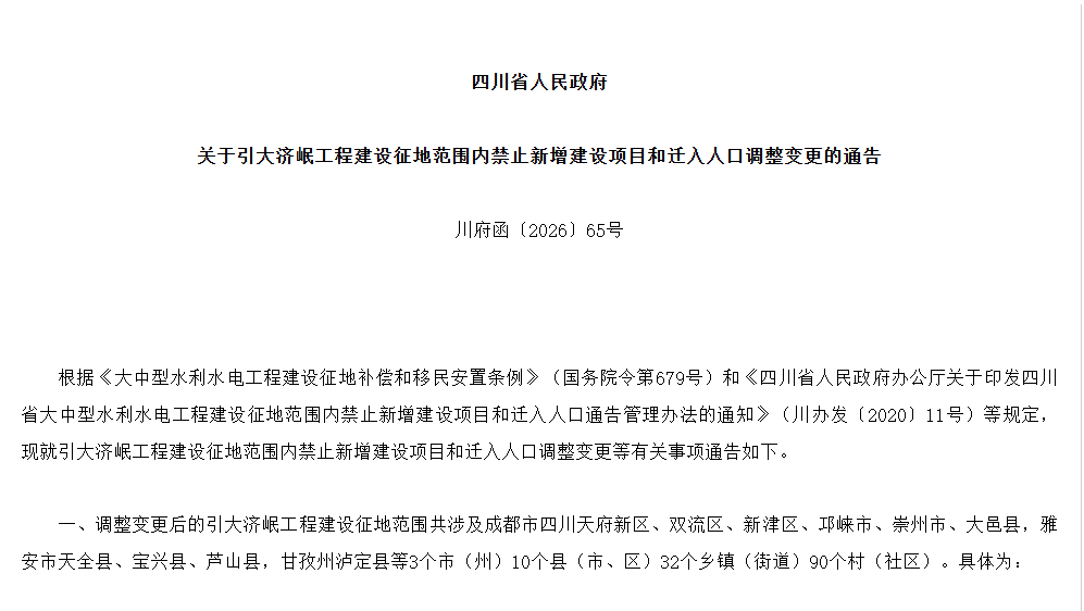 4月3日,四川省人民政府发布通告(川府函〔2026〕65号),对引大济岷工程建设征地范围内禁止新增建设项目和迁入人口事项进行调整变更。记者了解到,这是继2025年1月之后,省政府对该工程征地范围的又一次调整,原通知同时废止。