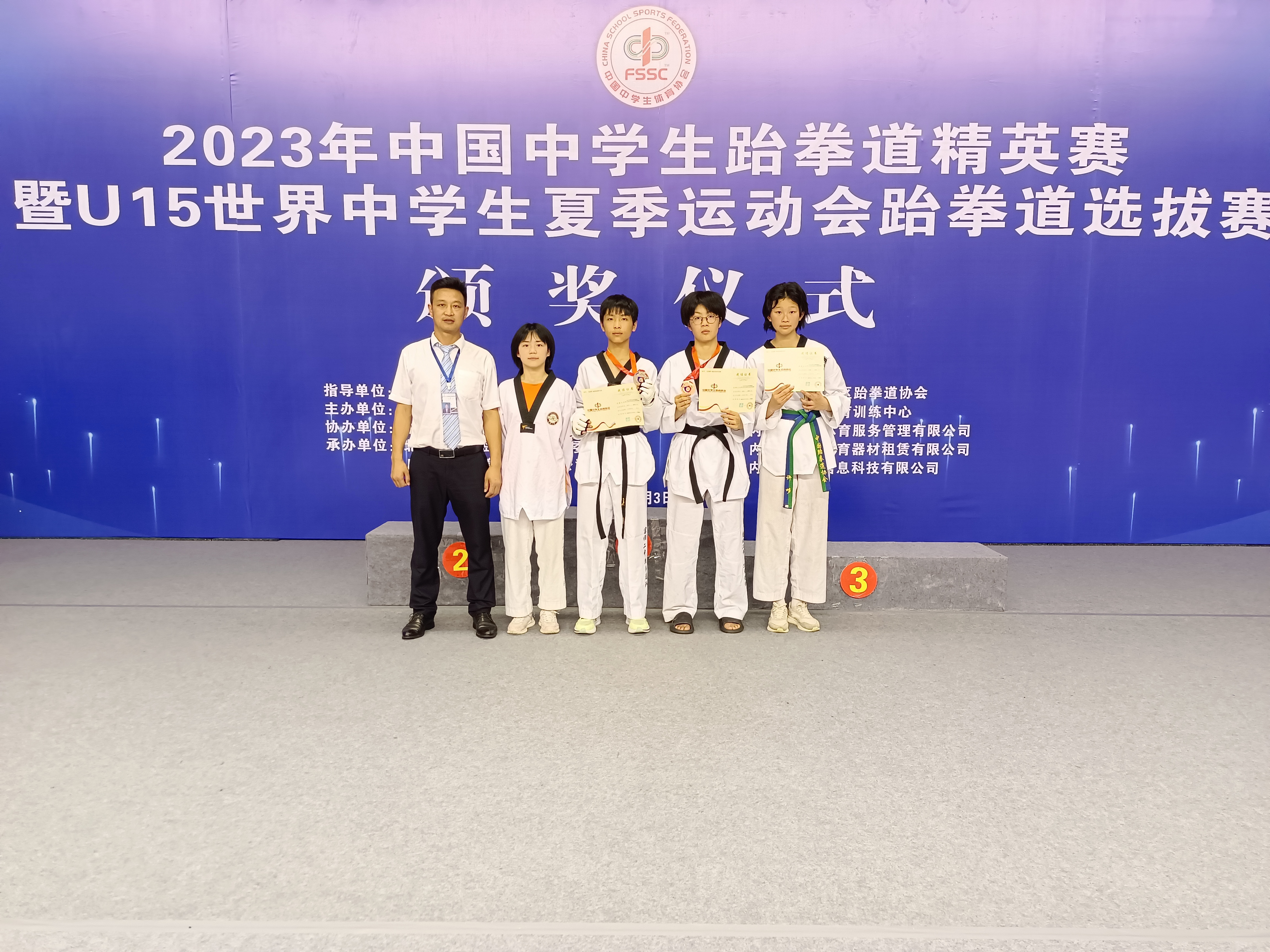 同时,该校初二(21)班张宇轩同学经过四场激烈鏖战,拼得亚军并取得世界中学生夏季运动会国家集训资格,有望参加在巴西举行的U15世界中学生夏季运动会跆拳道比赛。