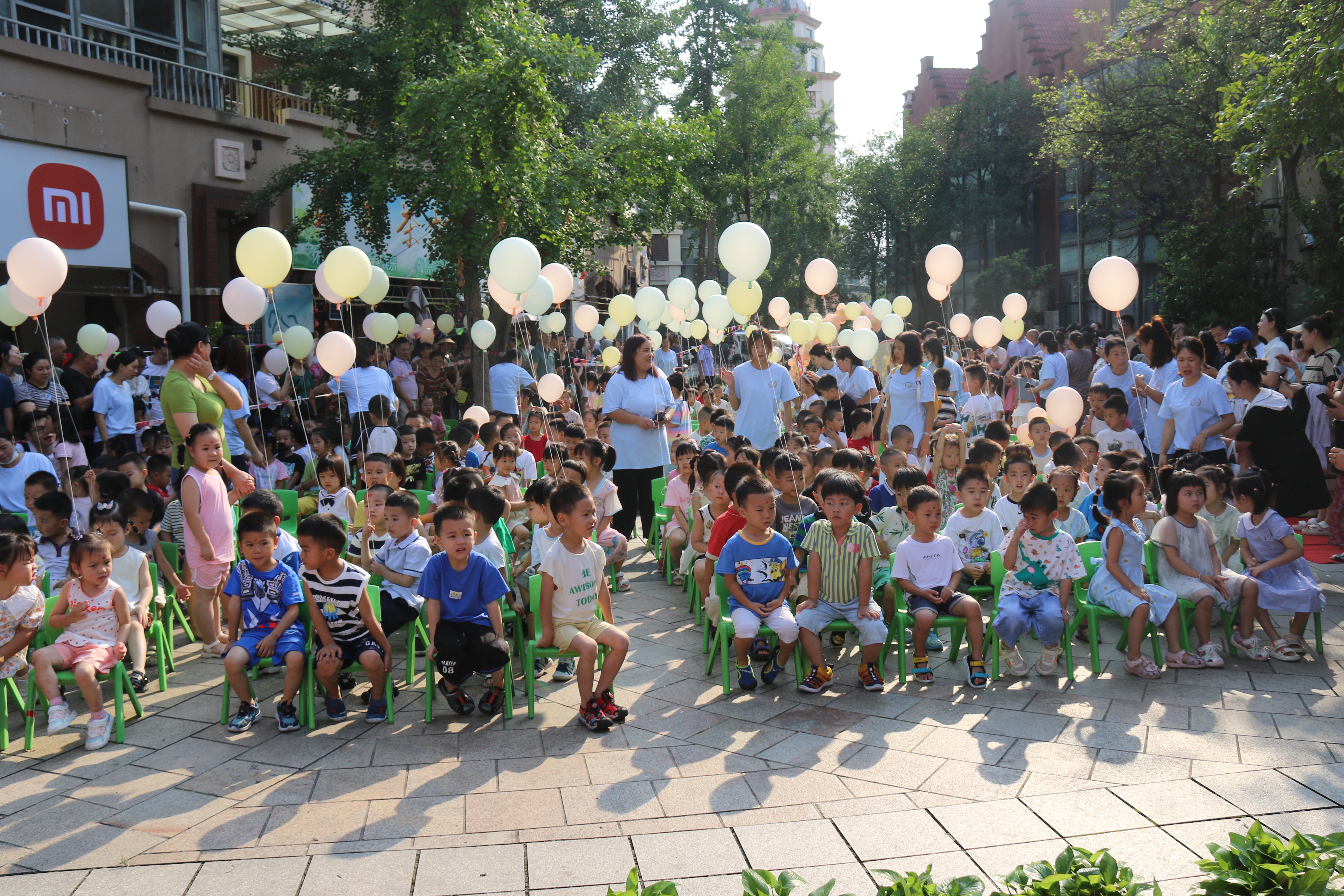 295名小朋友在老师的带领下,依次穿过气球拱门。在简短的开班仪式后,这些孩子将迎来为期一个月的暑期托管生活。