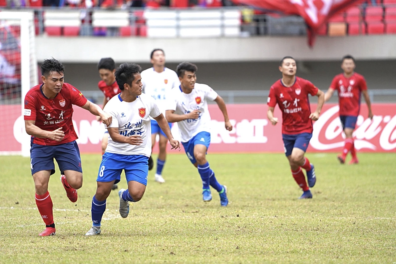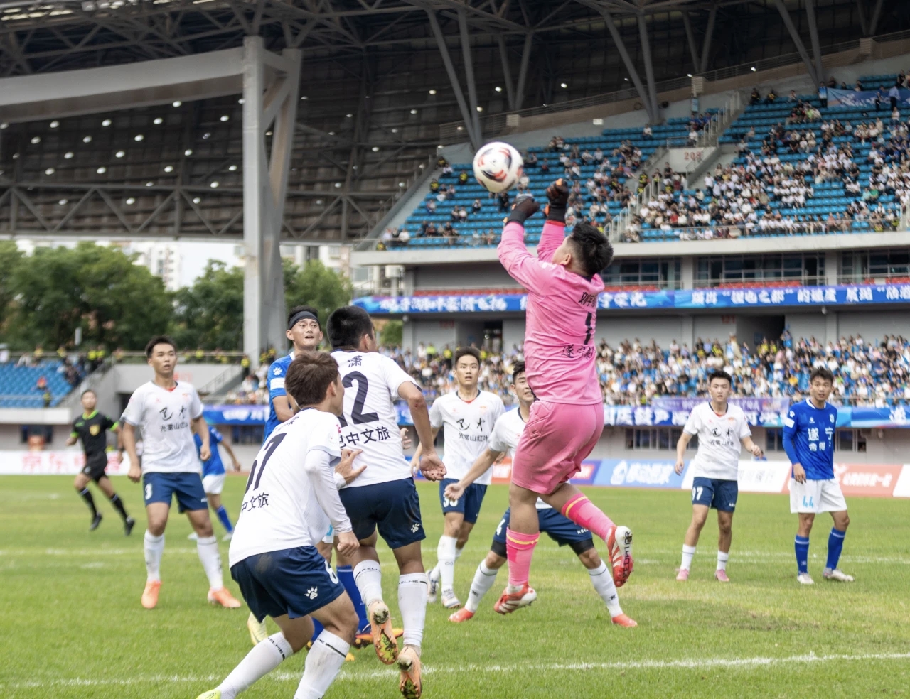遂宁舍得干队的门将正在拼抢。(图据遂宁文旅)