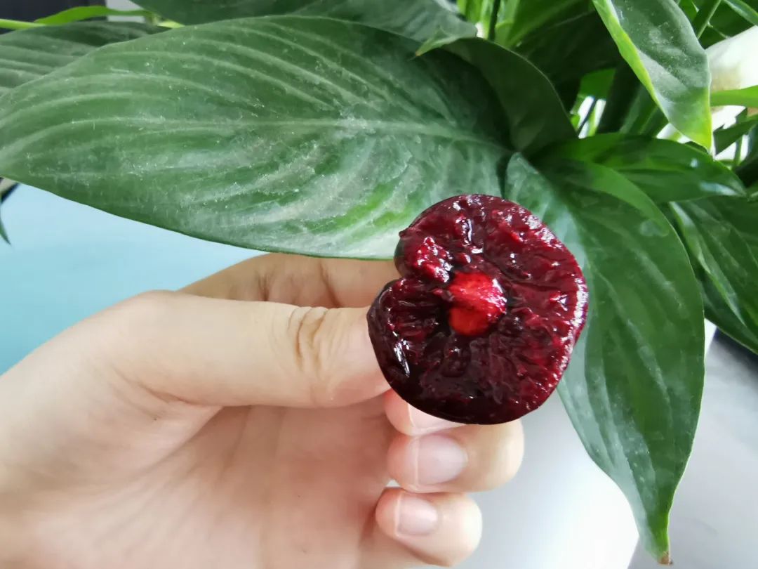 黑珍珠,恰如其名,果皮和果肉色泽都更偏紫黑色,是国产大樱桃中颜值比较出挑也比较好认的。此外,黑珍珠个头大果核小,吃起来的满足感和美早不相上下。