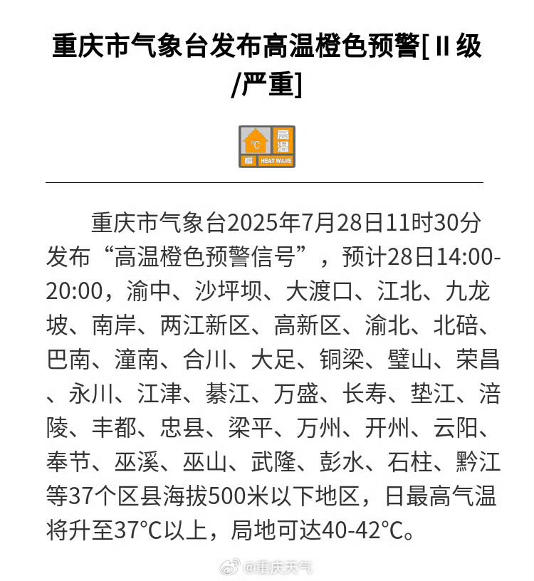 7月28日,重庆市气象台发布 “高温橙色预警信号”,从28日起连续三天,重庆将持续晴热高温天气,局部区域可能出现短时阵雨或雷阵雨。
