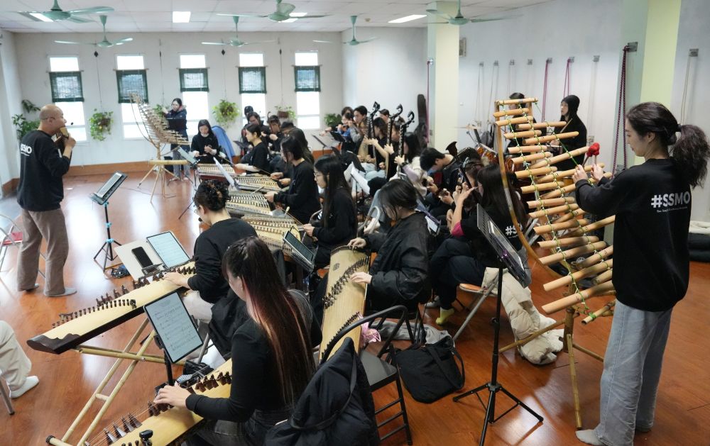 3月30日,在越南首都河内,童光荣(右上)指导“新活力”民族乐团排练。