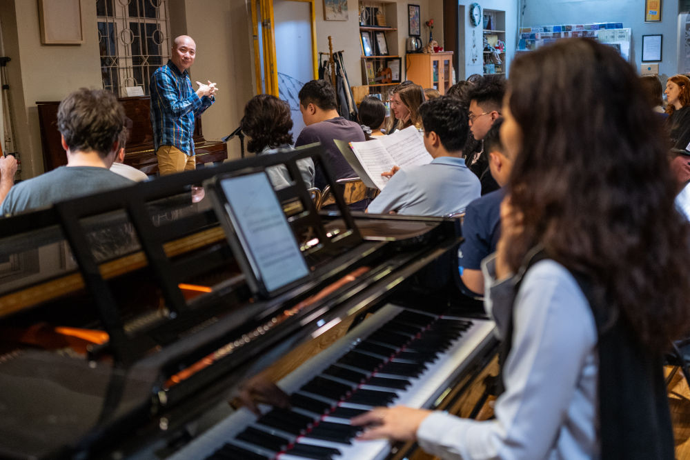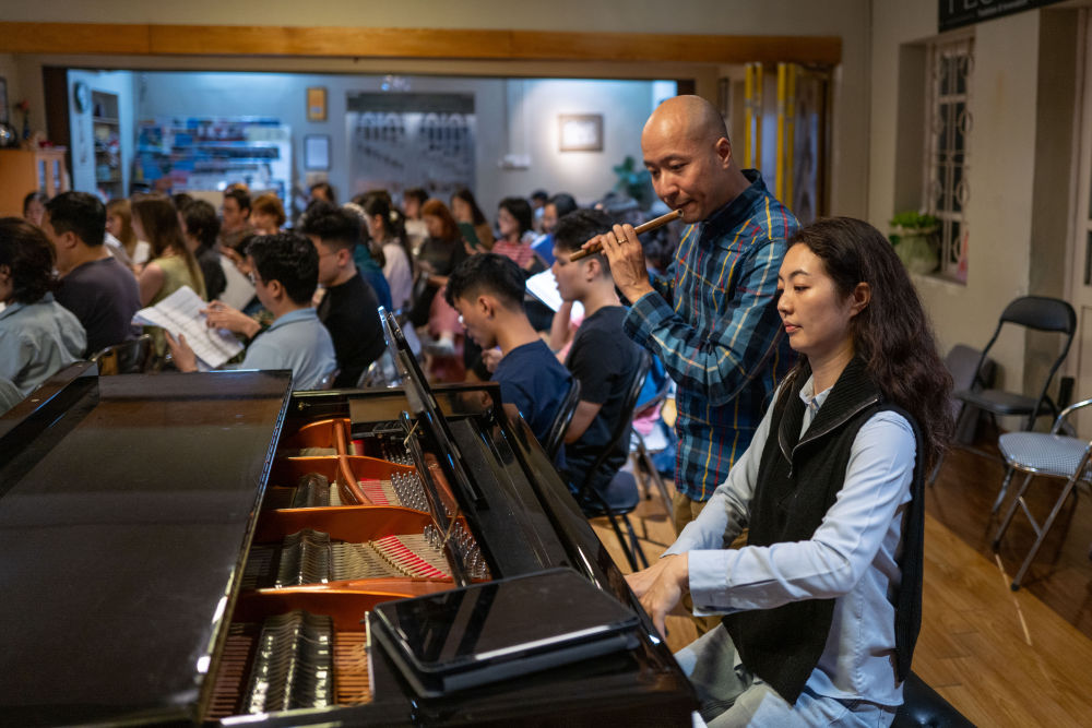 3月28日,童光荣与莫双双在位于越南首都河内的家中教授“新活力”民族乐团成员乐理知识。