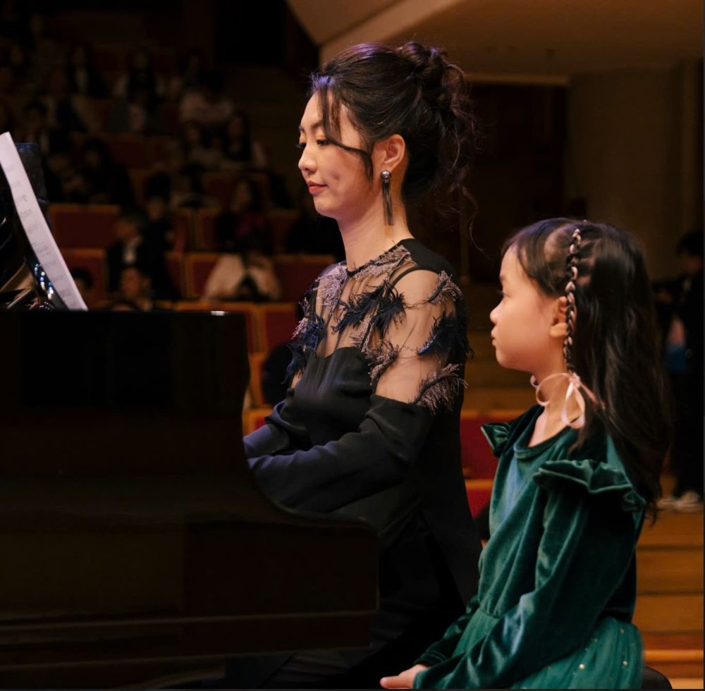 2024年12月8日,在位于越南首都河内的国家音乐学院,莫双双在一场音乐会中弹奏钢琴,女儿童棉绵在旁翻谱。