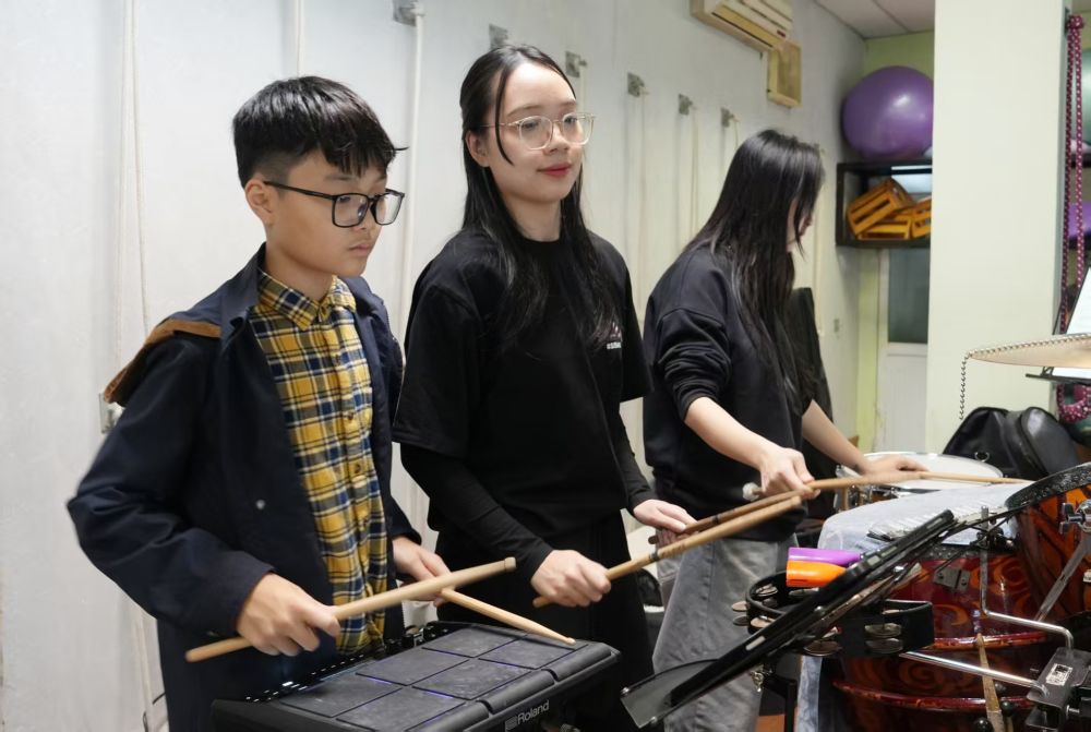 3月30日,在越南首都河内,两人的儿子童俊希(左一)参加“新活力”民族乐团排练。