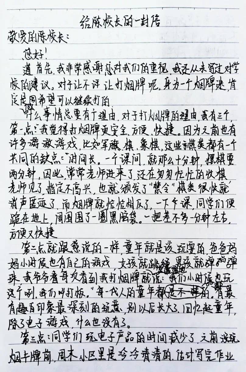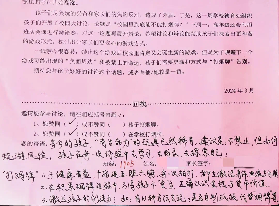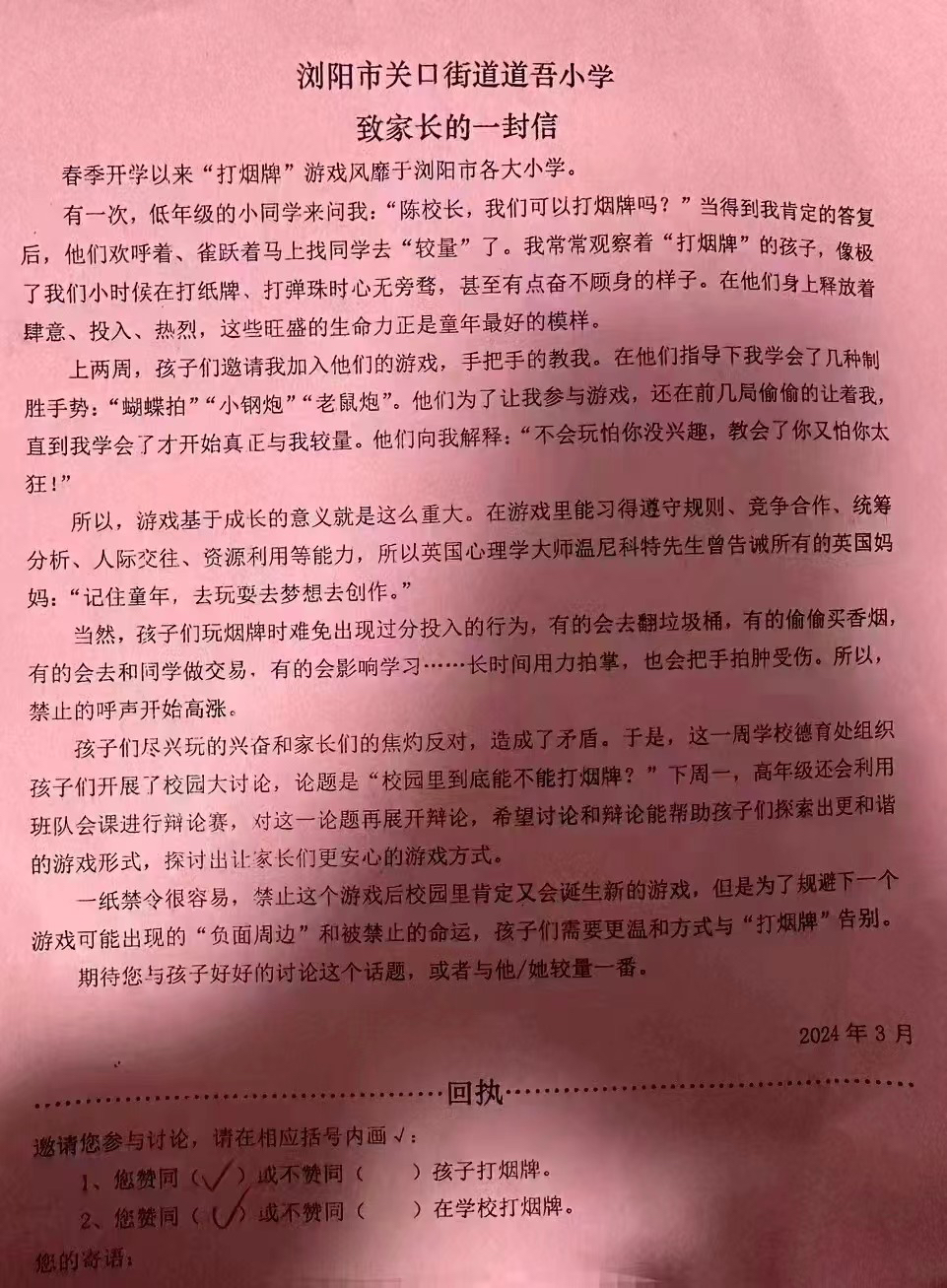 3月25日,道吾小学德育处进行了为期一周的关于“是否打烟牌”的讨论,孩子们开展主题班会和辩论,通过给校长的一封信表达观点。其中一封写道,“我非常感谢您对我们的重视,我还从未写过对学校的建议。”随后逻辑清晰地写明希望能继续“打烟牌”的理由。家长们也纷纷在来信回执上写下观点,给出反对或赞同的原因。