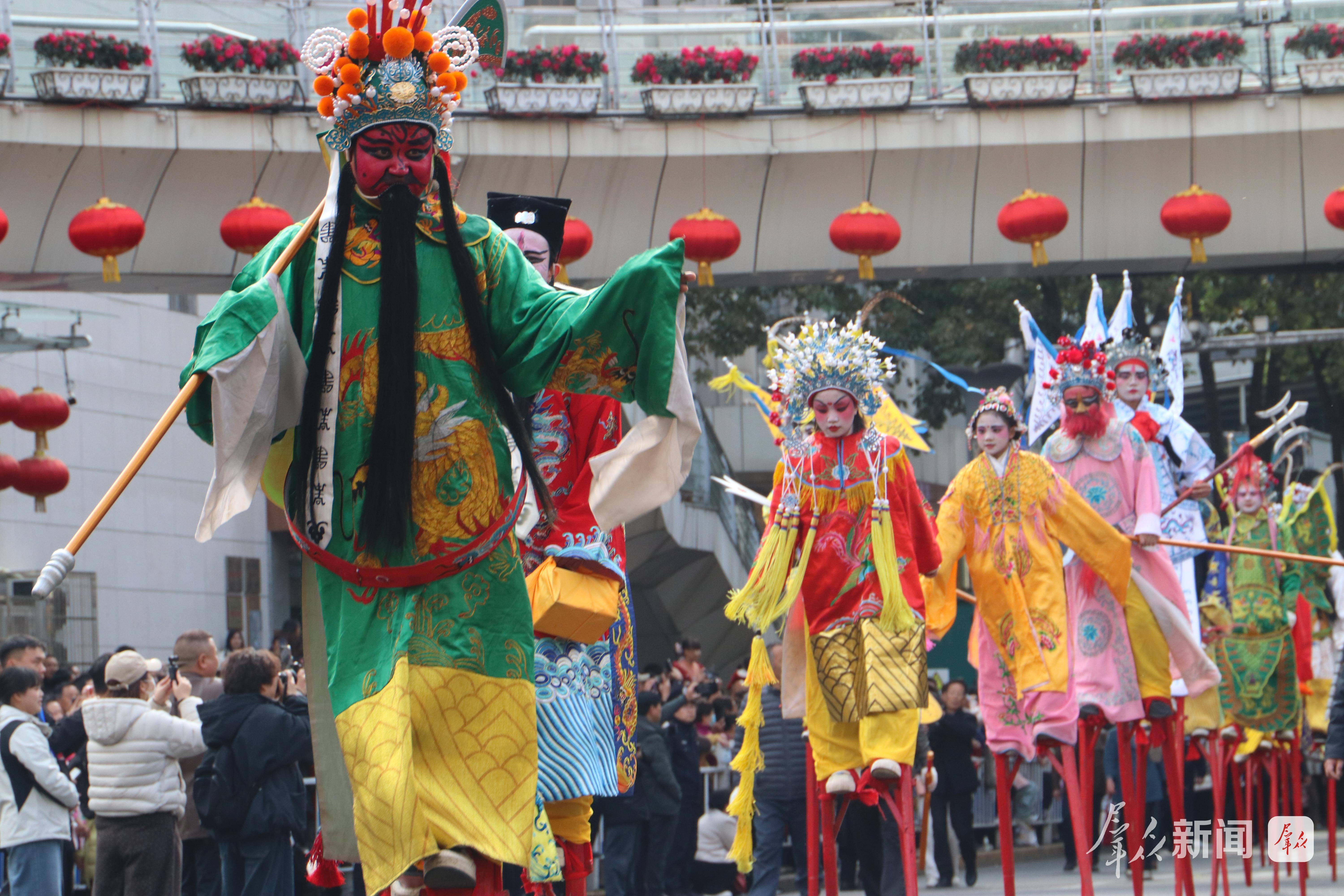 2月27日,演员在社火巡游中进行高跷表演。