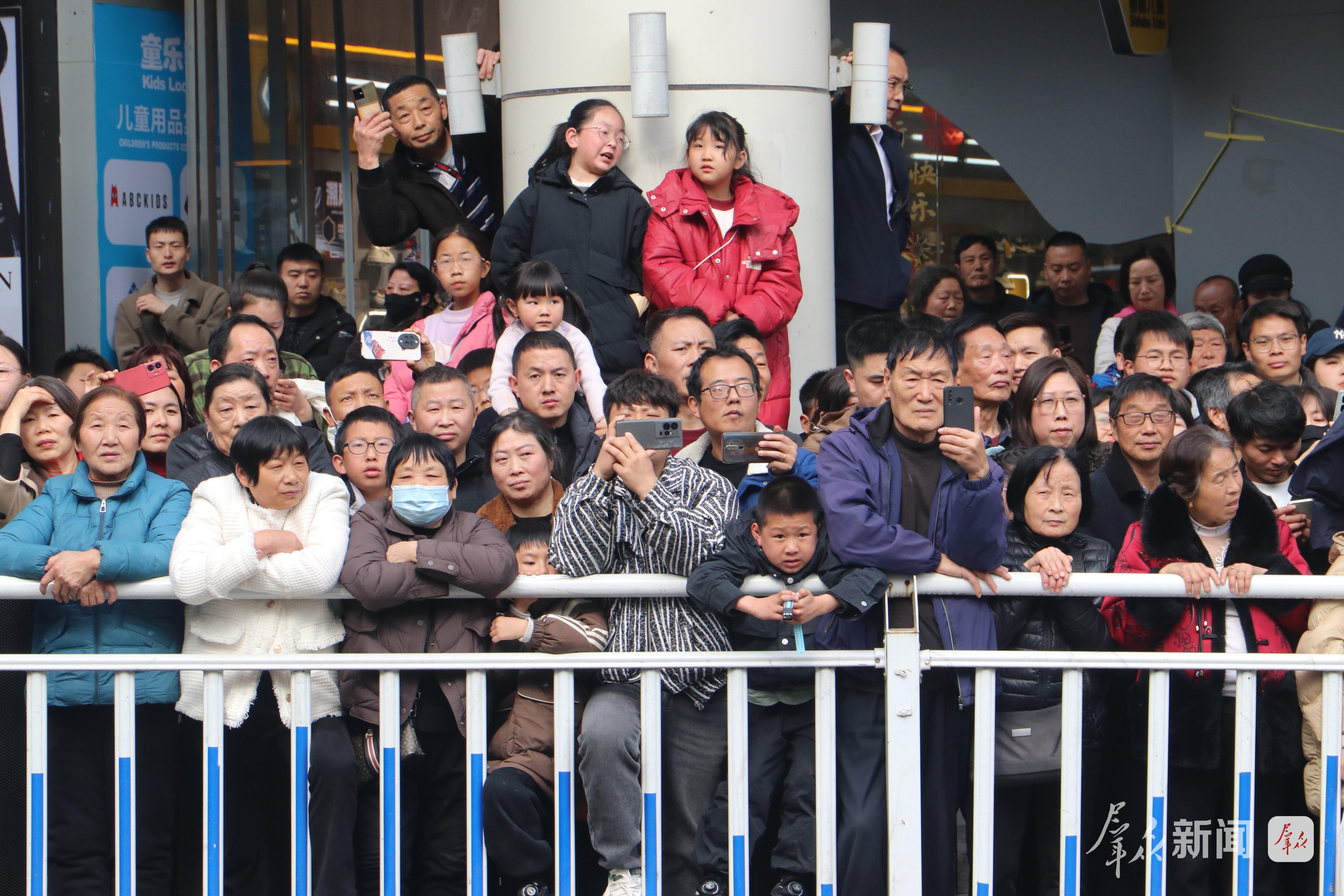巡游沿途,观众呼朋引伴、摩肩接踵,欢呼声、喝彩声此起彼伏。大家纷纷拿出手机、相机记录精彩瞬间,大人小孩脸上都洋溢着新春的喜悦,不少市民跟着队伍一路前行,沉浸式体验社火巡游的热闹。