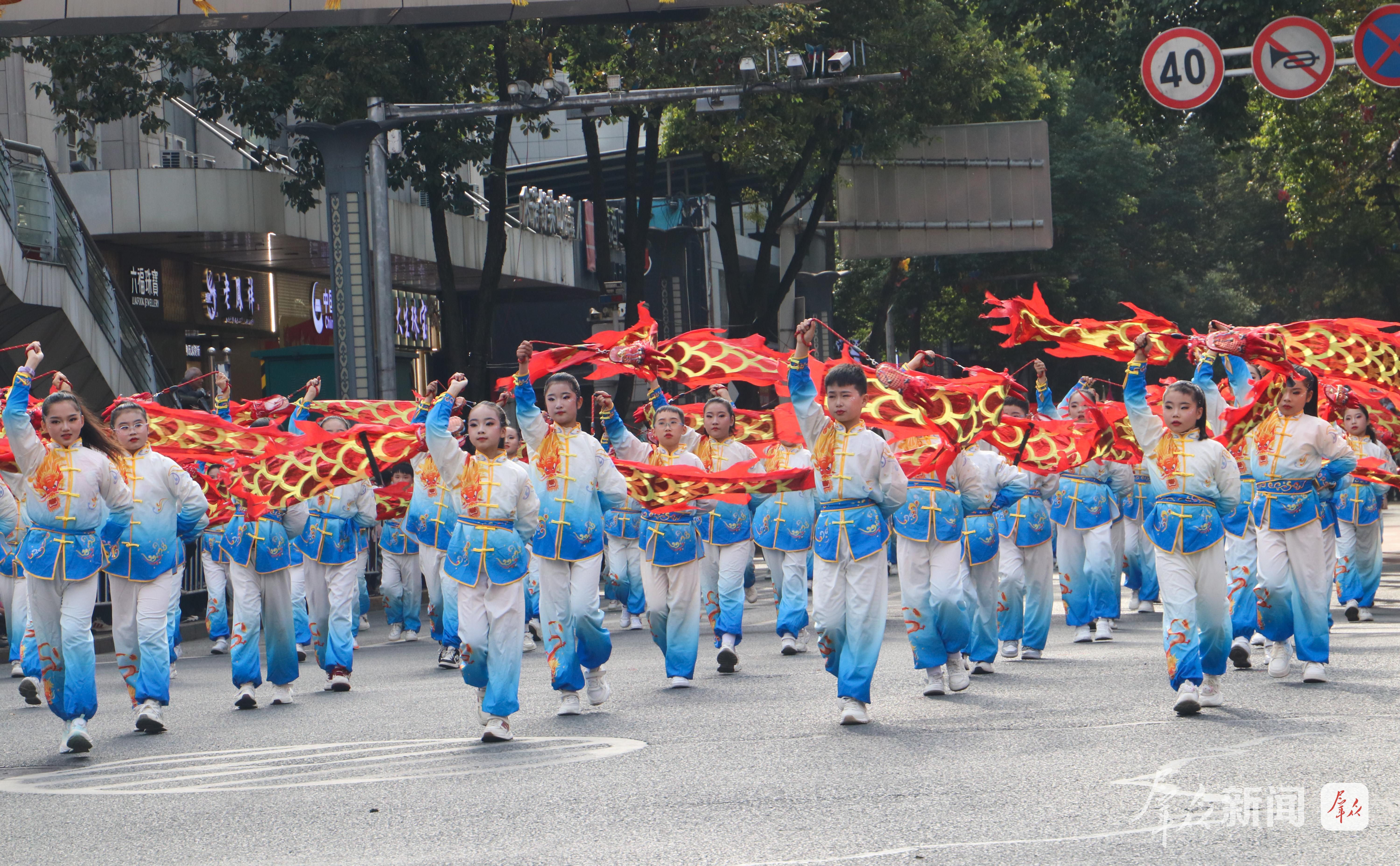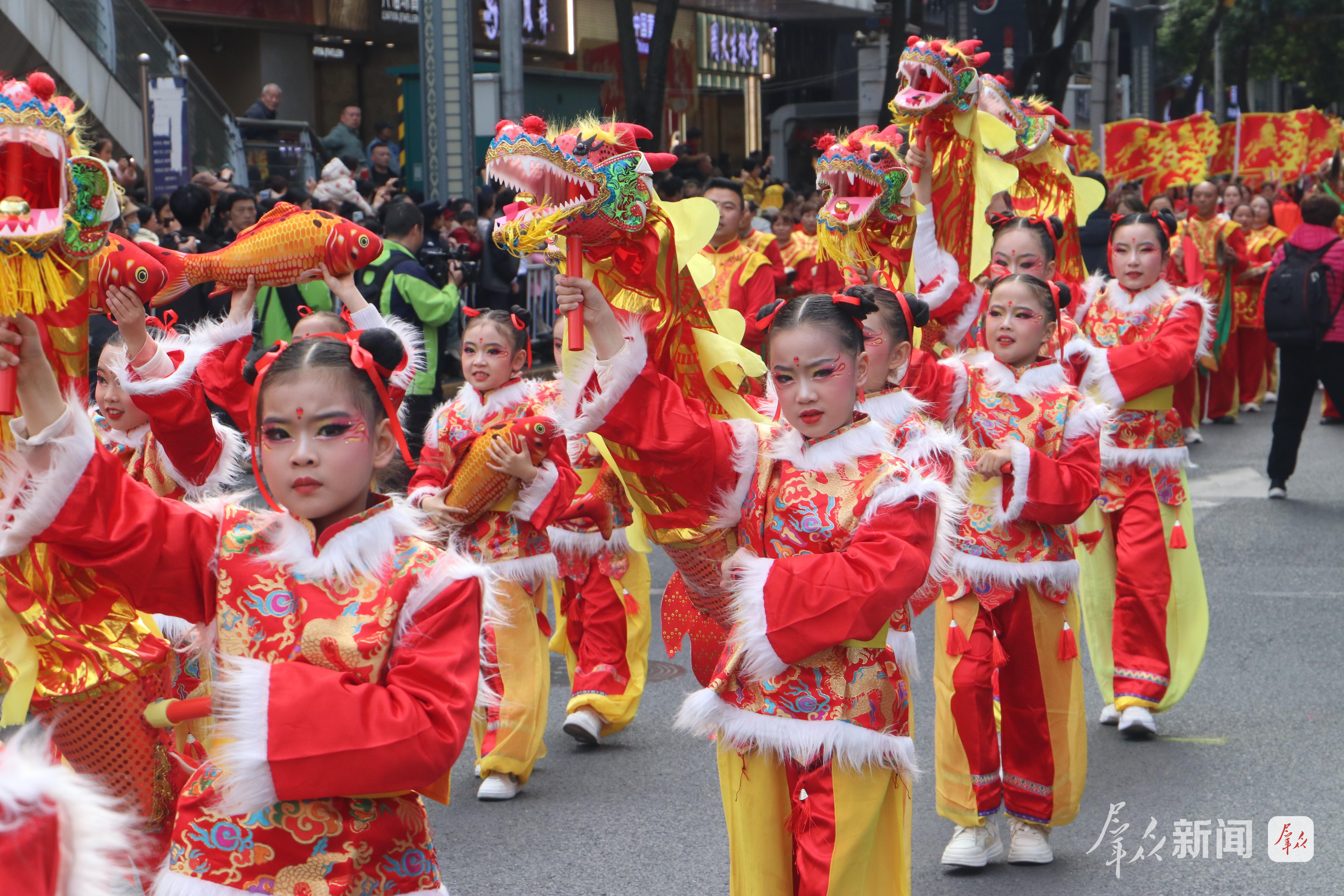 2月27日,演员在社火巡游中进行舞龙表演。