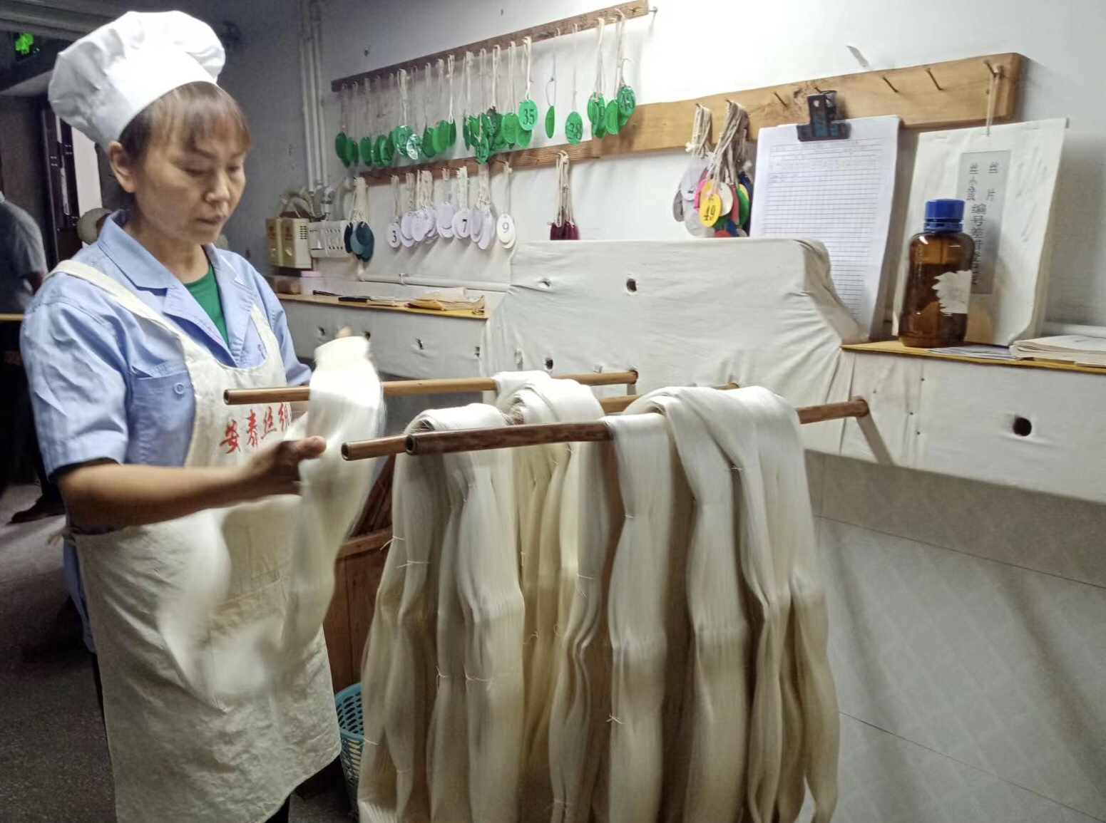 2022年7月1日,安泰集团缫丝车间机声隆隆,梭如流星,缫丝、编检、整理、打包……工人各司其职,一片忙碌景象。“我们生产的生丝,全部出口。”公司管理人员称。