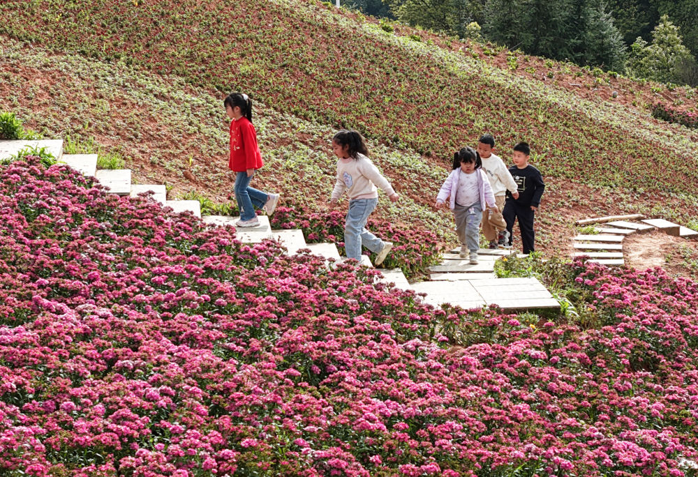 ↑4月3日,孩子们在重庆市酉阳土家族苗族自治县叠石花谷景区参加趣味拔河活动。新华社发(冉川摄)