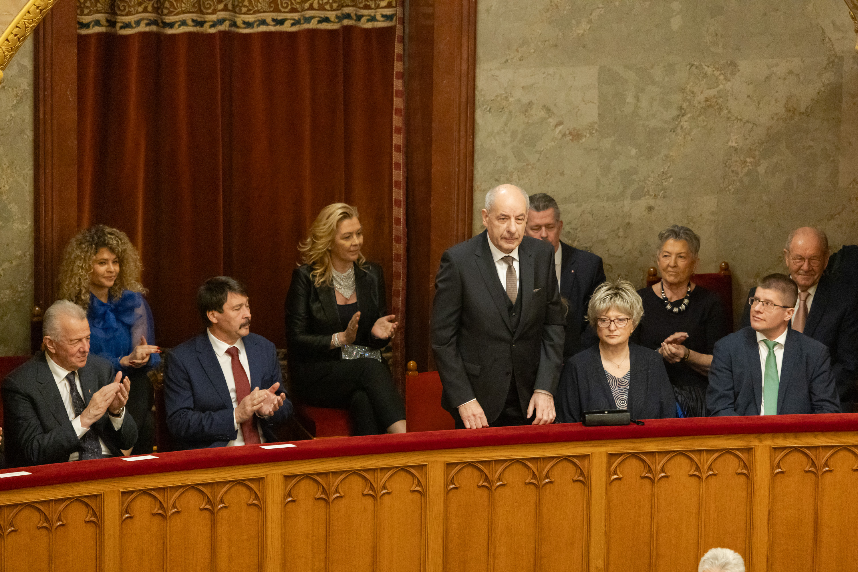 2月26日,在匈牙利布达佩斯,匈牙利当选总统舒尤克·道马什(前中)接受祝贺。新华社发(弗尔季·奥蒂洛摄)