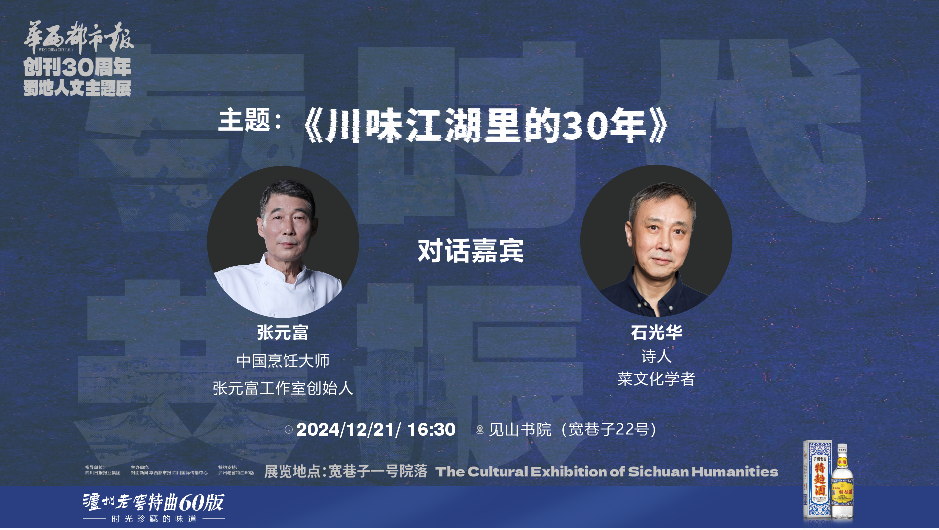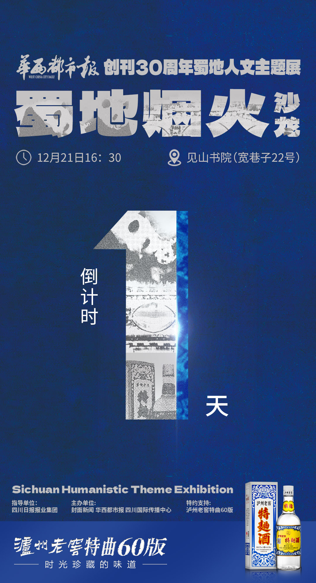 12月21日下午16:30,由四川日报报业集团指导,封面新闻、华西都市报主办,四川国际传播中心联合主办,泸州老窖特曲60版特约支持的“与时代共振——华西都市报创刊30周年蜀地人文主题展”文化沙龙,又将在成都宽窄巷子见山书院与大家见面。