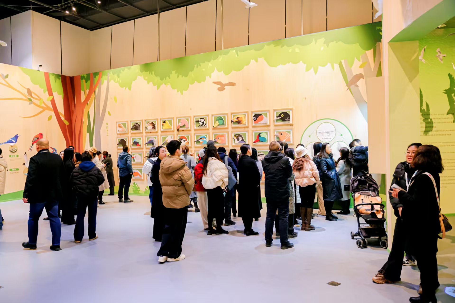 值得一提的是,本次策展突破传统模式,在筹备阶段面向成都市中小学生发放上千份问卷,精准回应青少年对鸟类深度科普的需求。同时,展览也将“儿童友好”理念融入每一处细节。在空间设计上,下沉展示高度依据儿童身心特点打造沉浸式互动展厅,营造平等、自主的探索环境。在内容呈现上,通过故事化叙事、艺术化装置与游戏化互动,将科学知识转化为生动体验。