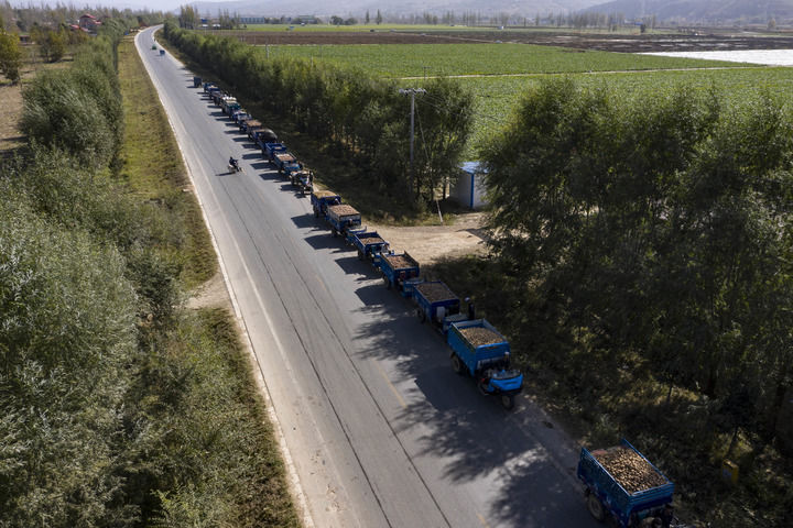 交售马铃薯的农用车在宁夏固原市西吉县马莲乡一家淀粉厂门前排起长队(2020年10月21日摄,无人机照片)。新华社记者 王鹏 摄