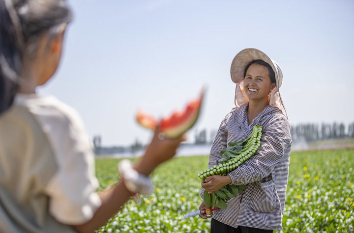 在宁夏青铜峡市瞿靖镇毛桥村蔬菜基地,来自贵州的苗族务工人员杨文高(右)在采收间隙和女儿聊天(2024年8月23日摄)。新华社记者 杨植森 摄