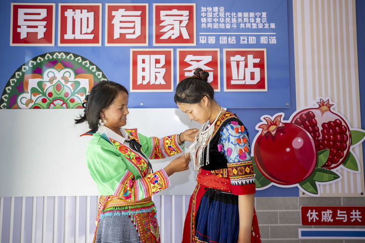 在宁夏青铜峡市瞿靖镇毛桥村“异地有家”服务站,来自贵州的苗族务工人员杨文高(左)在给放暑假的大女儿整理服饰。杨文高将民族服饰从老家带到宁夏,在工作之余就会穿上民族服饰(2024年8月23日摄)。新华社记者 杨植森 摄