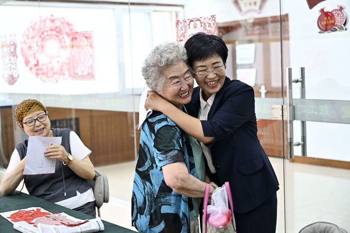 宁夏银川市金凤区长城花园社区书记赵耐香(右一)在社区“才艺堂”与居民交流(2024年6月20日摄)。新华社记者 王鹏 摄