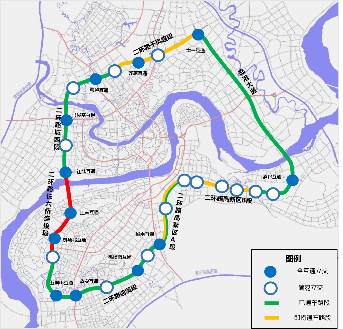 其中新建段的纳溪段、长江六桥北连接线段、沱江六桥连接线段、高新A段已开放通行;高新B段(城南大道-泰安大桥)、城北千凤路段(春雨路-临港大道)将于9月29日开放通行;届时二环路全线将只剩下长江六桥南连接线和桥梁主线暂未开通,全线贯通时间预计在今年12月31日前。