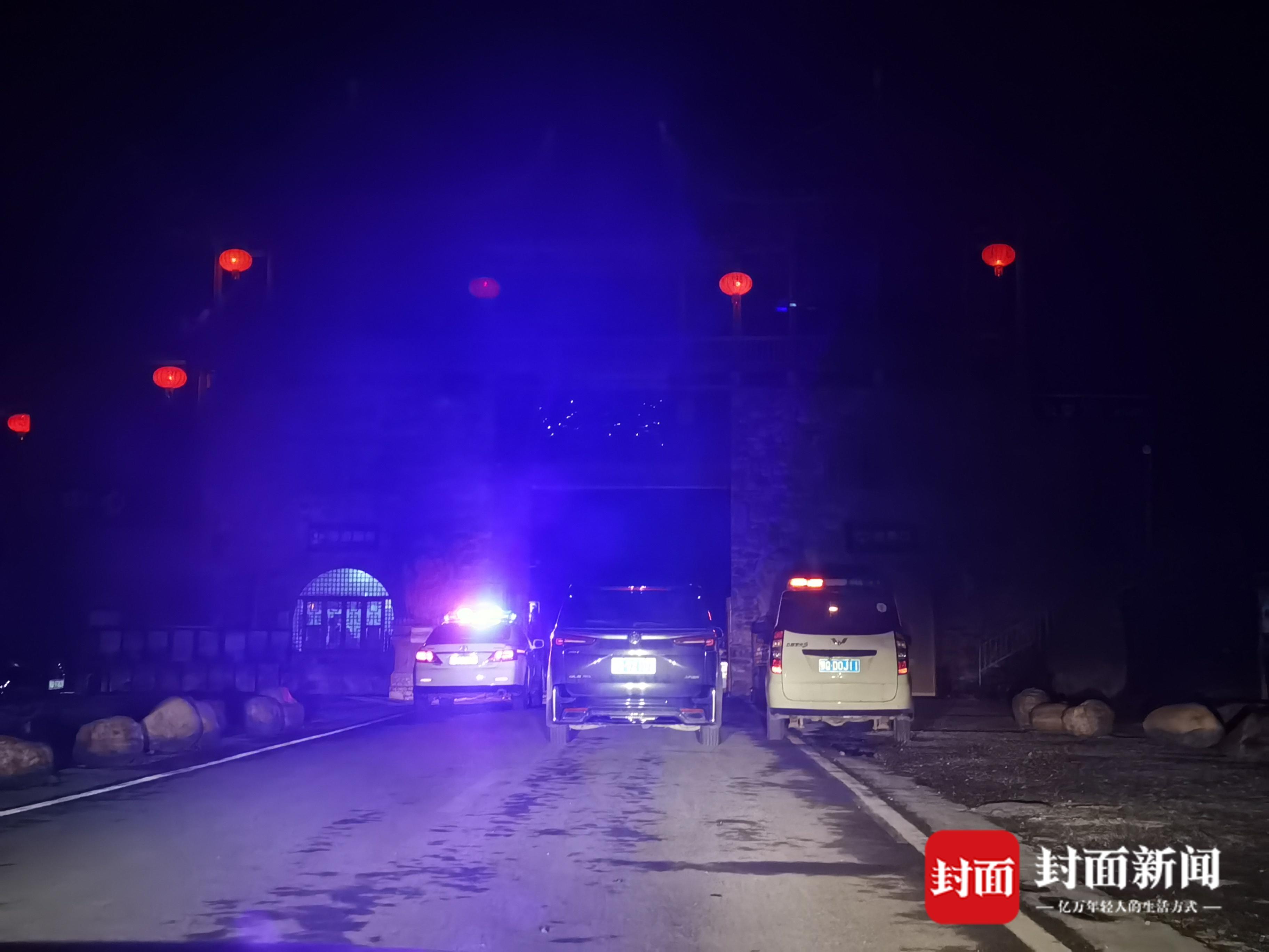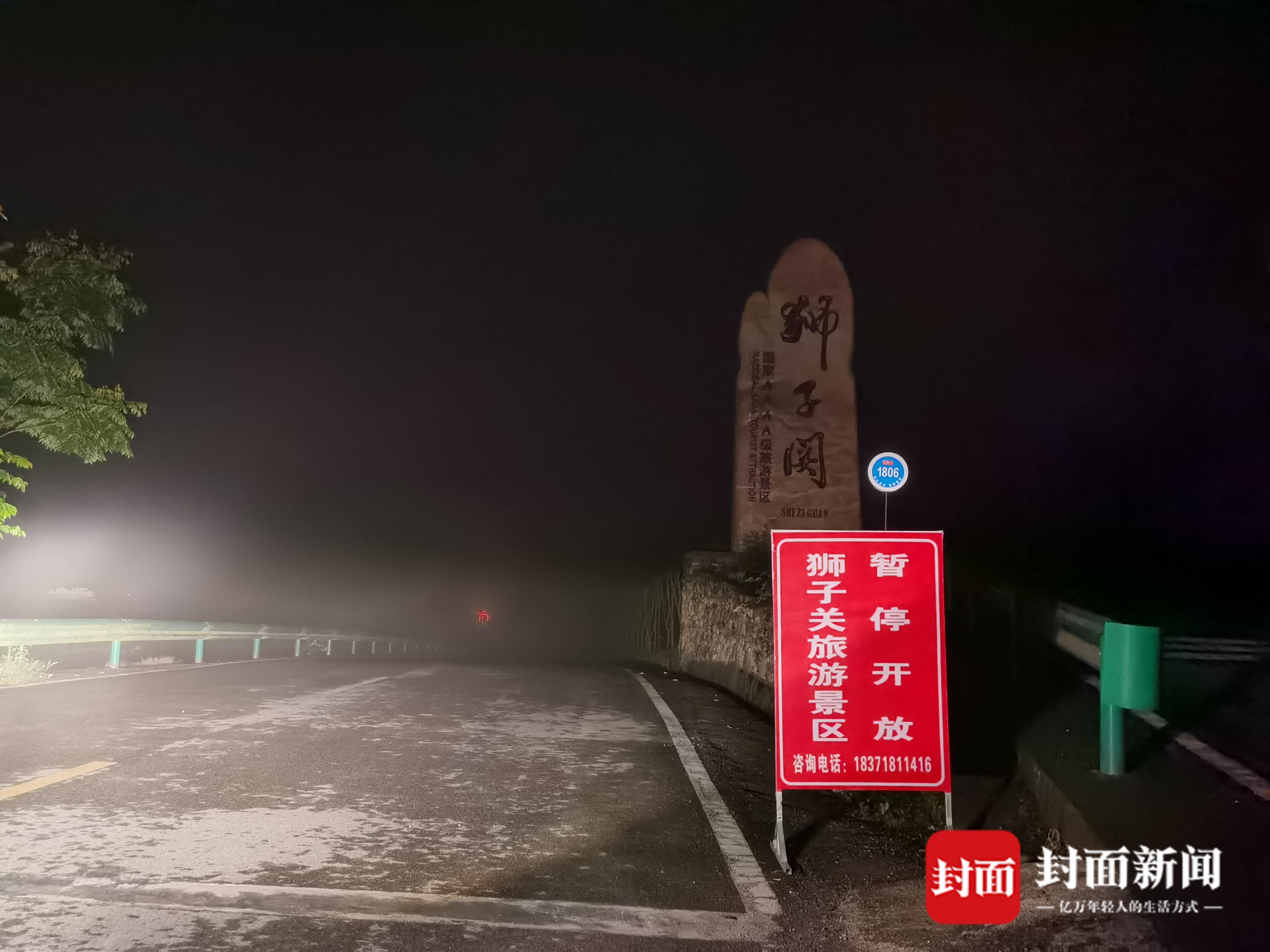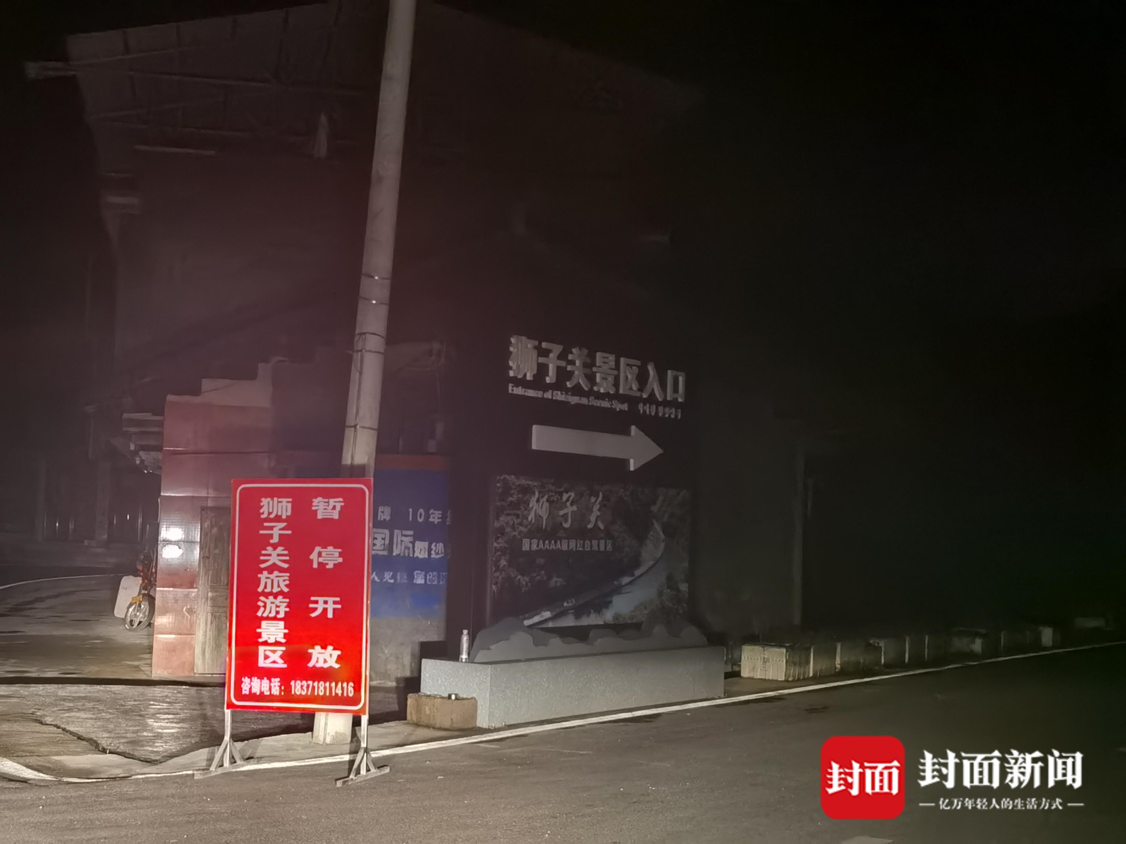 当晚,封面新闻记者到狮子关景区外进行探访,在即将到达景区的路上,有两处标牌提示景区暂停开放。景区大门外,有两辆警车及人员值守。