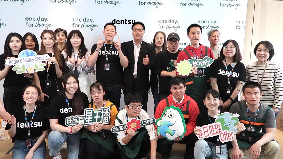 除此之外,电通在每一年的“地球日”当月会开展One Day for Change项目,鼓励全球员工去做对社会有贡献的事情。今年“地球日”前夕,电通中国与自闭症青年机构“星乐家园”合作,向这群特殊的青年提供“主播”的实习机会,直播卖货筹集37930元,直播期间累计观看人数超2800人,另外还有近600名员工参与环保回收。