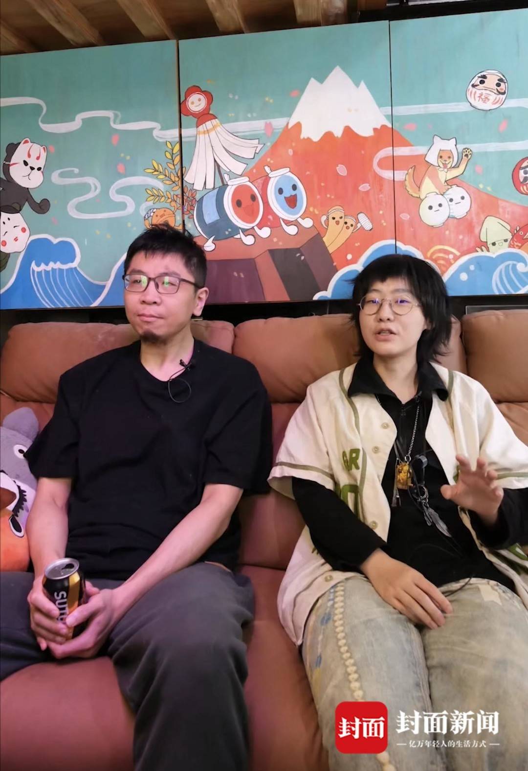 “豆丁92”(左)和女友接受封面新闻记者采访