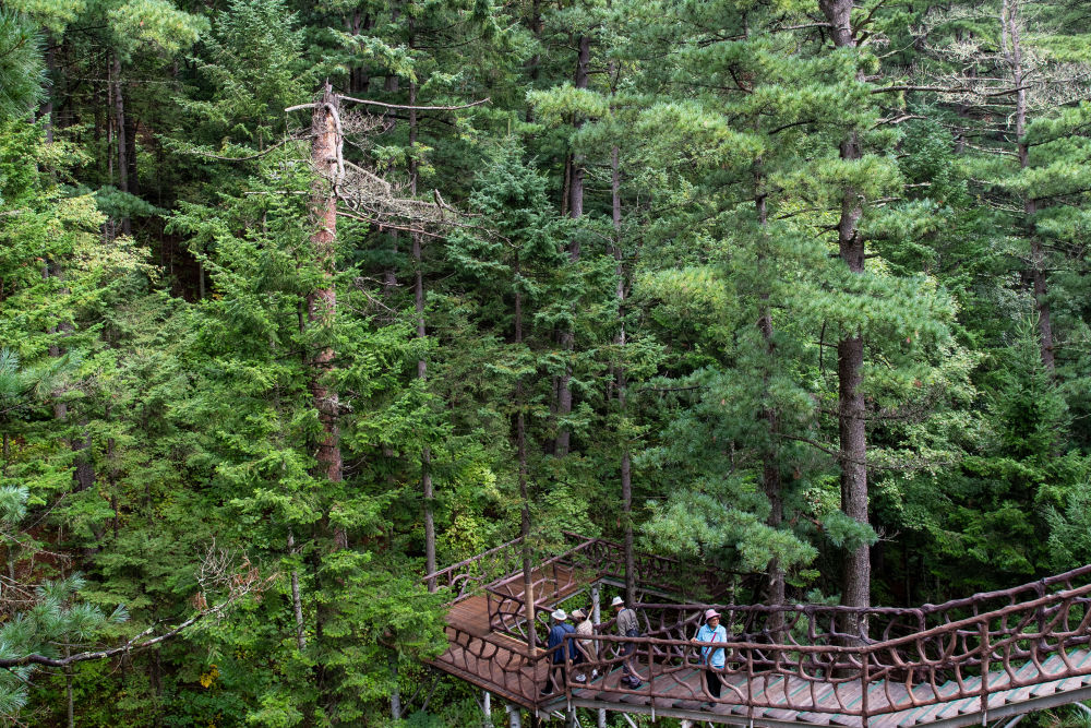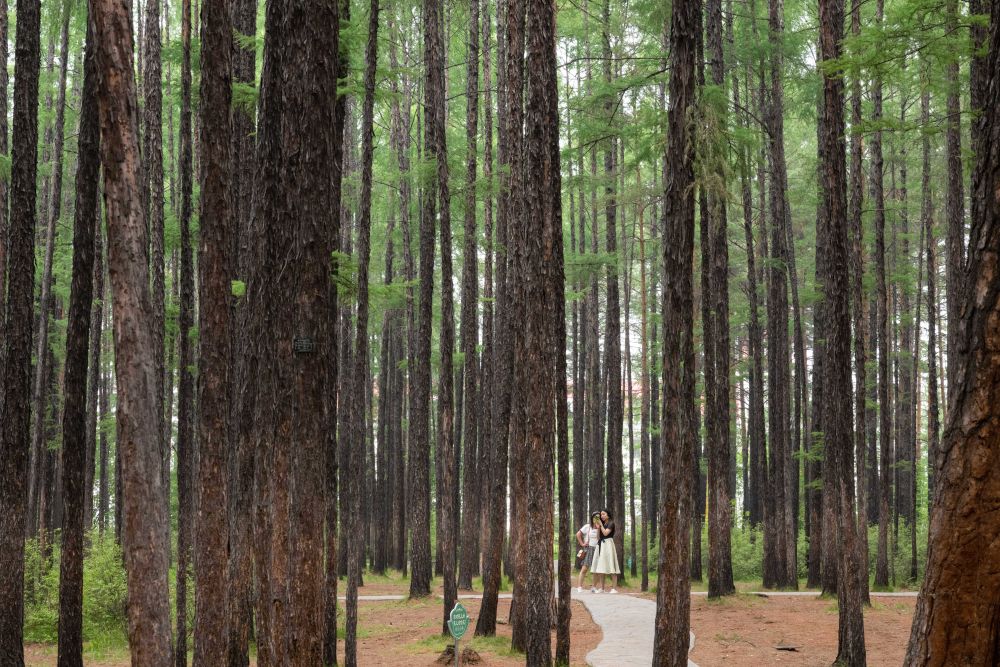 ↑8月27日,游客在黑龙江伊春市上甘岭溪水国家森林公园内游览。新华社记者 张涛 摄