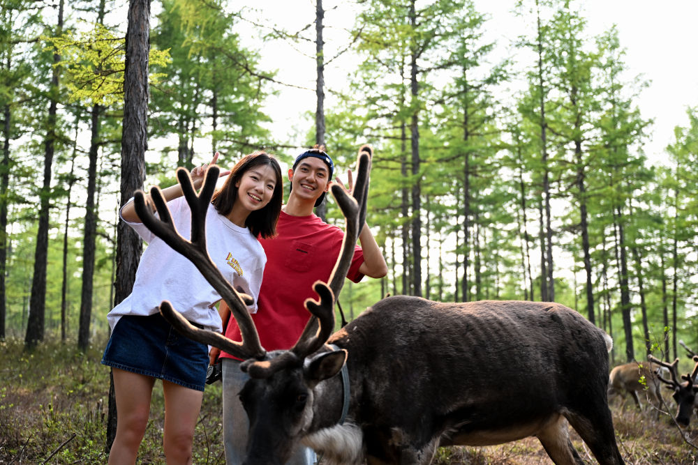↑7月3日,游客在内蒙古呼伦贝尔市根河市阿尤莎驯鹿放养点游玩。新华社记者 贝赫 摄