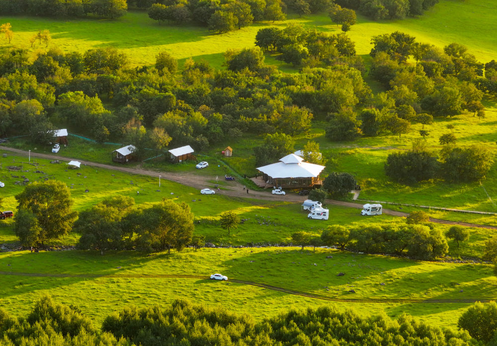 ↑这是8月8日拍摄的内蒙古兴安盟乌兰毛都草原深处的一家民宿(无人机照片)。新华社记者 连振 摄