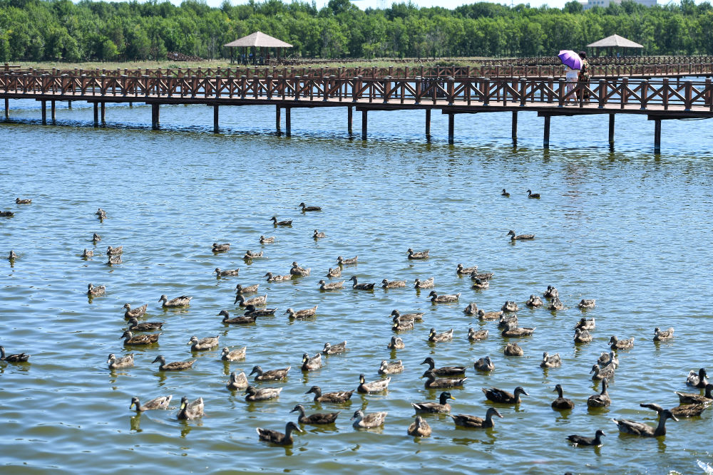 ↑8月26日,游客在吉林省松原市查干湖野鸭岛游览。新华社记者 张楠 摄