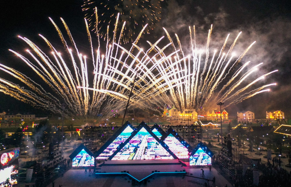 ↑在内蒙古兴安盟阿尔山市拍摄的2023年中国(阿尔山)旅游大会开幕前一晚的焰火表演(2023年9月1日摄,无人机照片)。新华社记者 连振 摄