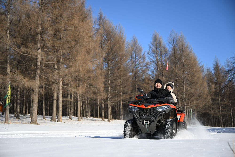 ↑游客在内蒙古兴安盟阿尔山市驾驶雪地摩托游玩(2023年12月14日摄)。新华社记者 贝赫 摄