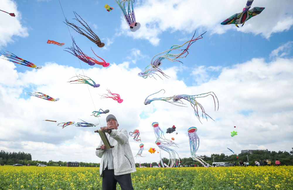 ↑在辽宁省康平县,一名风筝爱好者在风筝节活动现场放风筝(5月31日摄)。新华社记者 龙雷 摄
