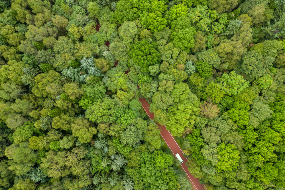 ↑8月27日,游客乘坐电瓶车在黑龙江伊春市上甘岭溪水国家森林公园内穿行(无人机照片)。新华社记者 张涛 摄