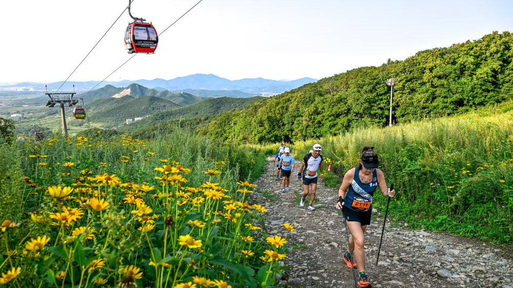 ↑8月24日,越野跑爱好者在吉林市万科松花湖度假区越野跑。新华社记者 颜麟蕴 摄