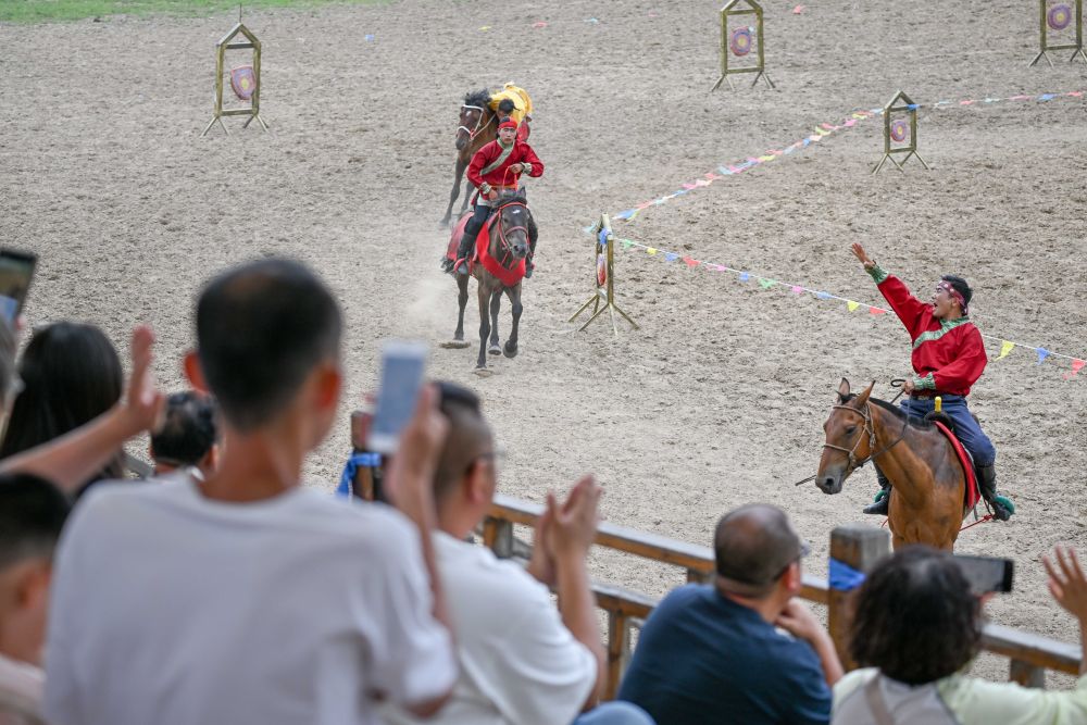 ↑8月8日,游客在内蒙古兴安盟科尔沁右翼前旗乌兰毛都草原观看马术实景剧。新华社记者 连振 摄
