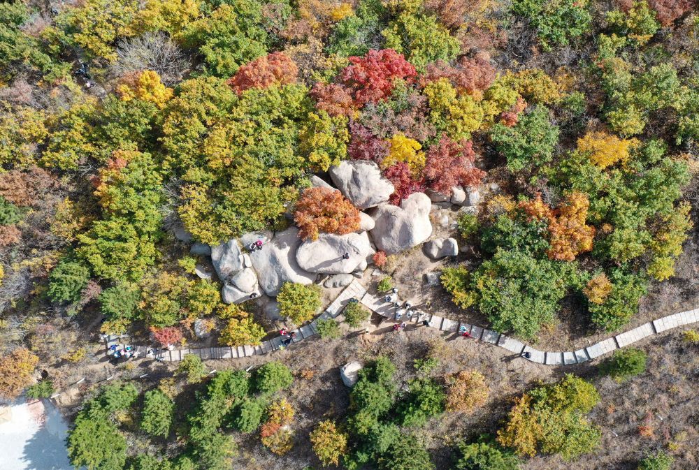 ↑游客在辽宁阜新的海棠山游览(2023年10月19日摄,无人机照片)。新华社记者 龙雷 摄