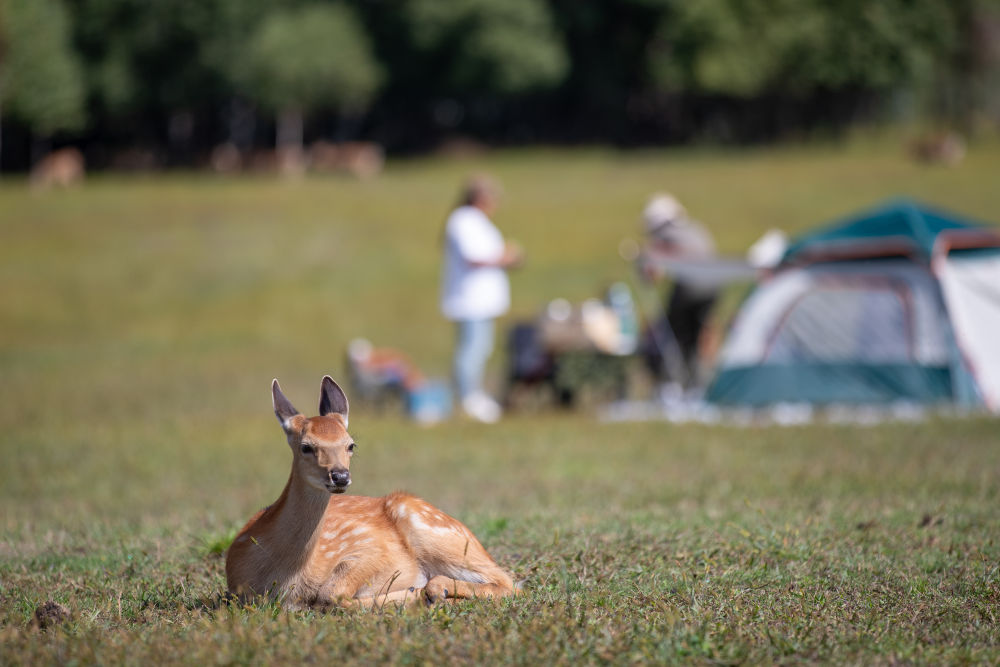 ↑8月27日,在黑龙江伊春市上甘岭溪水国家森林公园鹿溪牧场,一只鹿在草坪上休息。新华社记者 张涛 摄